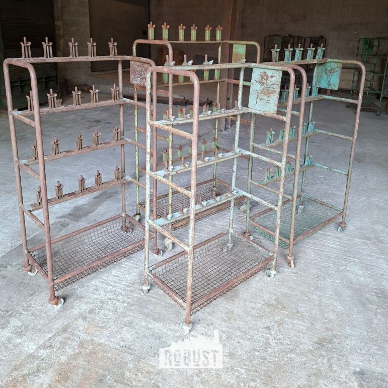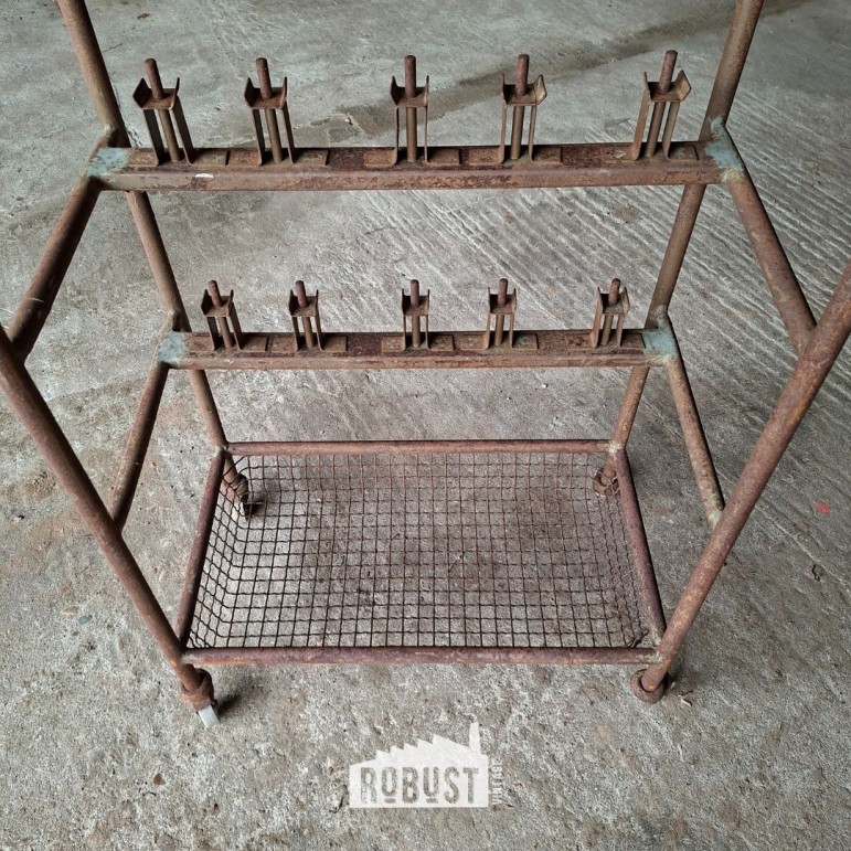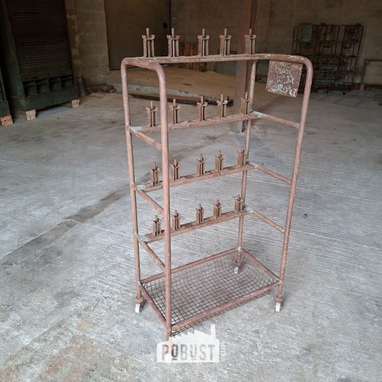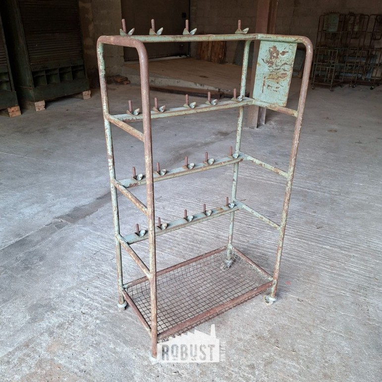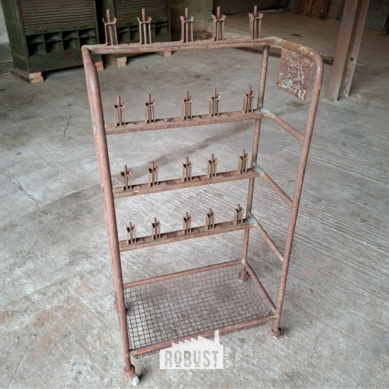 Dit industriële rolrek uit een schoenenfabriek draagt zijn verleden met trots. Ooit gebruikt in het productieproces, waar schoenen op mallen werden geplaatst en verplaatst. Vandaag is het een bijzonder werkrek / schoenrek / metalen rolwagen met een zacht gekleurde patina en een mooi roestig karakter.