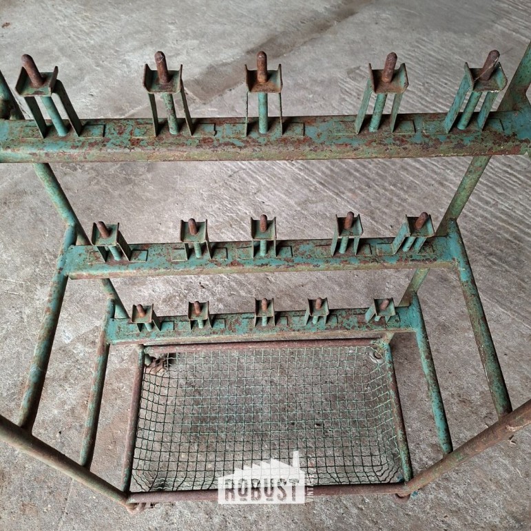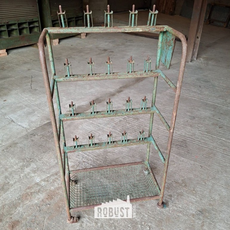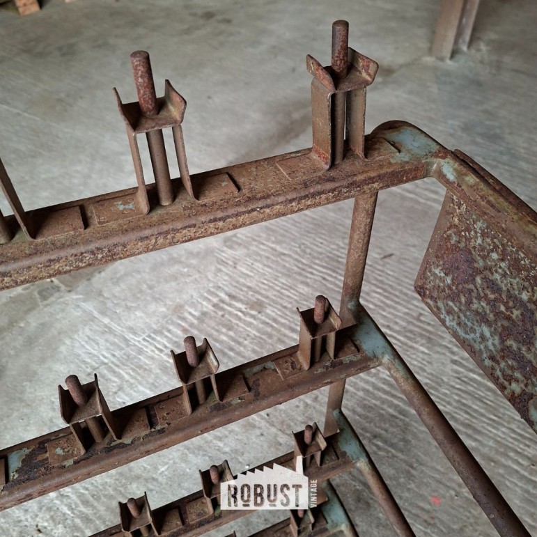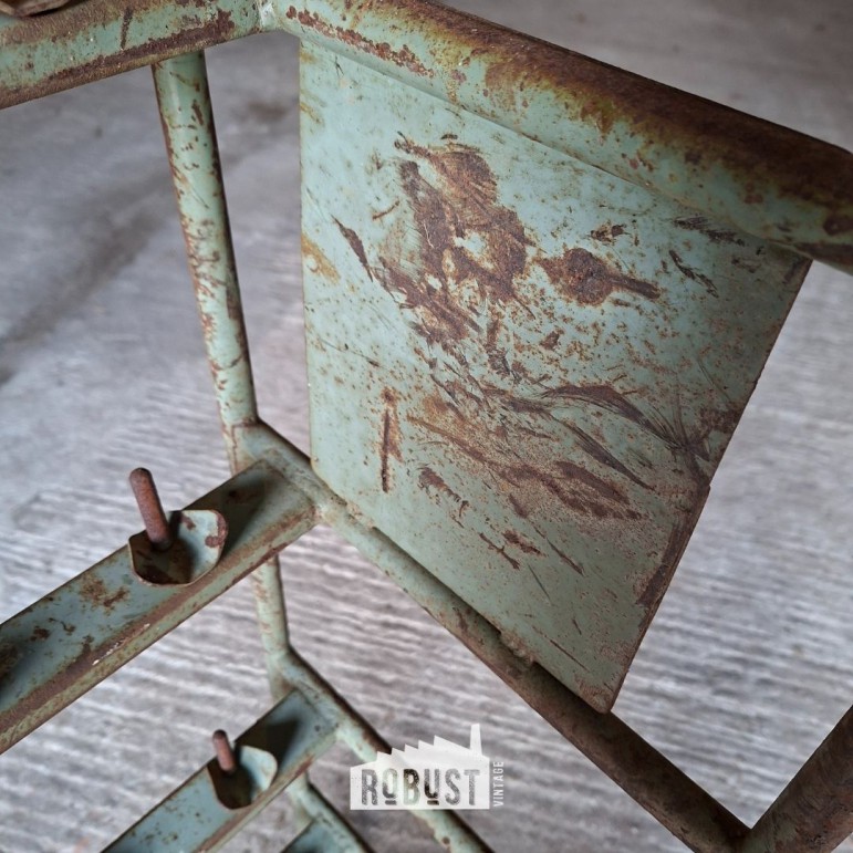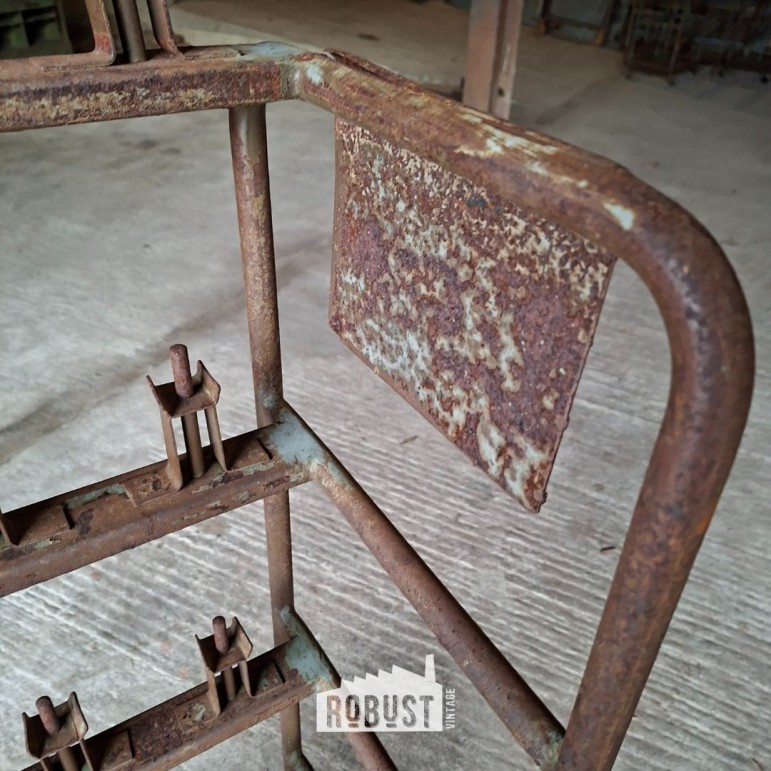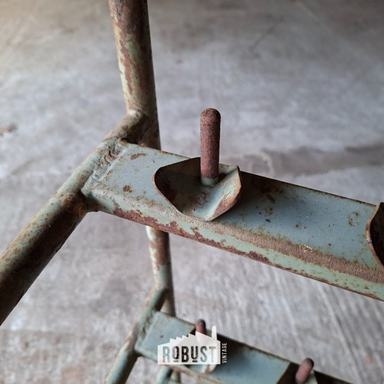 Onderaan bevindt zich een metalen mand, handig om materiaal, dozen of losse spullen in te zetten. Achteraan zie je nog de haken waarop schoenen met mal en al werden geplaatst — een detail dat meteen het verhaal van dit stuk vertelt. Het metaal heeft een zachte tint gekregen door de jaren heen, gecombineerd met subtiele roestsporen die het geheel net dat extra leven geven.