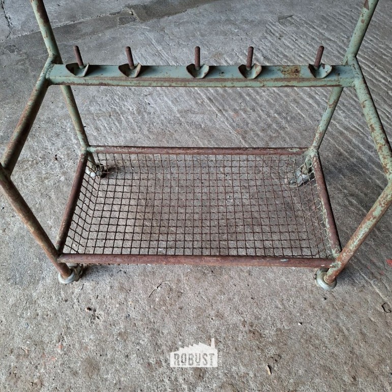 Industrieel rolrek uit schoenenfabriek – metalen werkrek met karakter