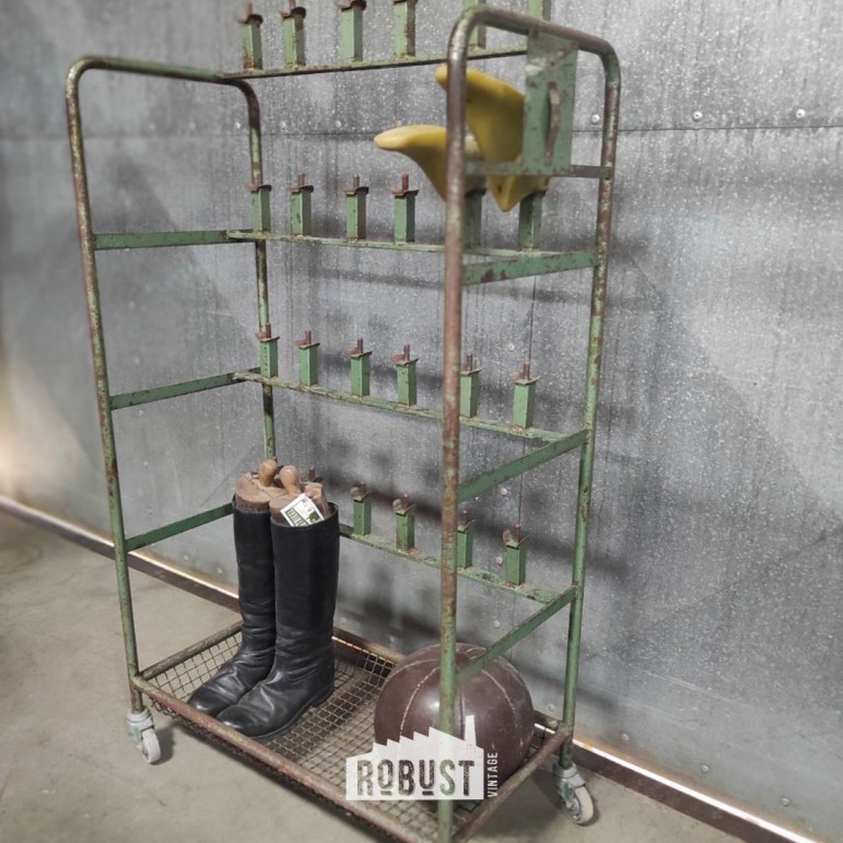 Industrieel schoenrek op wielen – metalen fabriekrek met patina