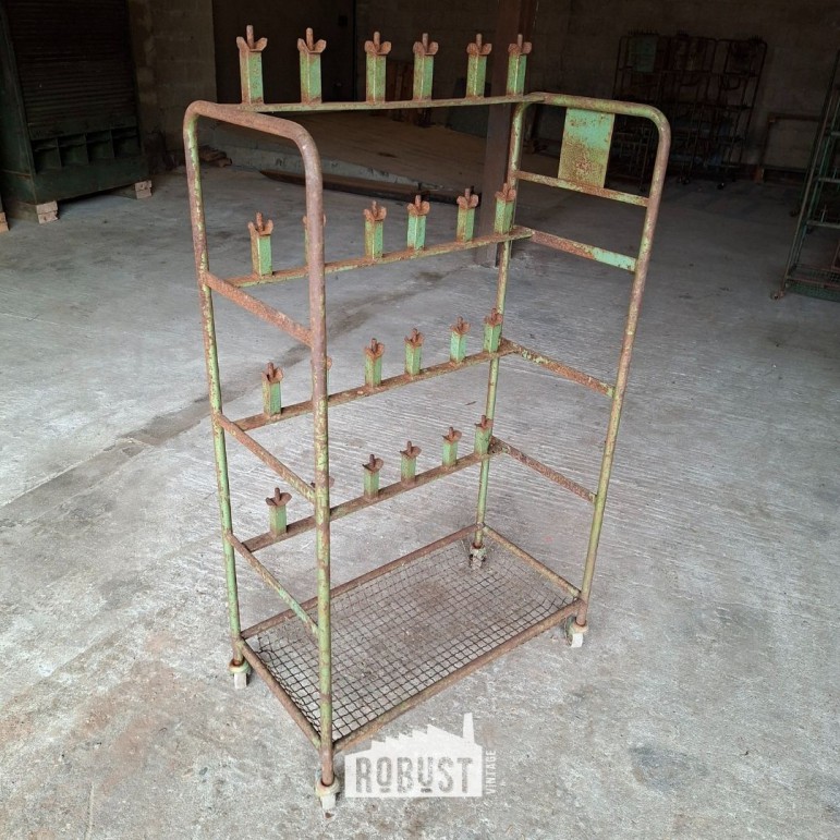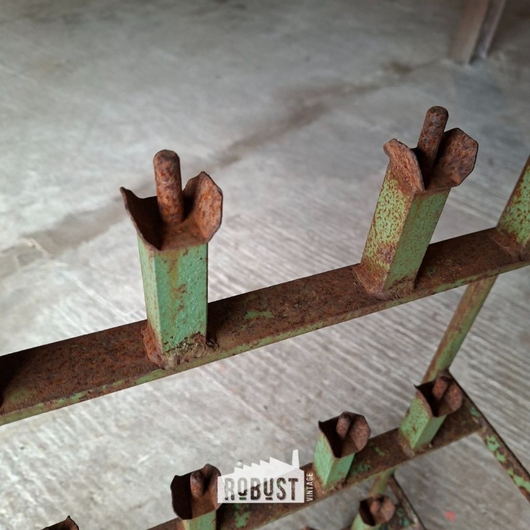 Dit industriële schoenrek op wielen komt rechtstreeks uit een productieomgeving waar gewerkt werd, niet gestileerd. Een robuust metalen werkrek / displayrek / rolrek met een zachte, doorleefde kleur en een mooi roestig karakter dat alleen tijd kan maken.