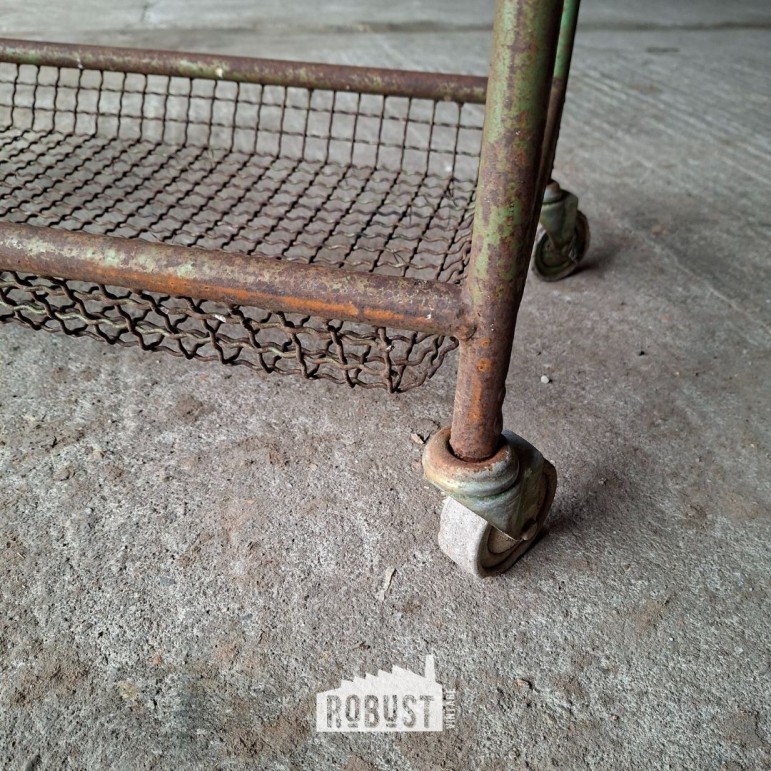 Het rek staat op wieltjes die door de jaren heen hun werk hebben gedaan. De meeste rollen nog goed. Indien gewenst kunnen ze vervangen worden, maar ook in hun huidige staat dragen ze bij aan de authentieke uitstraling.