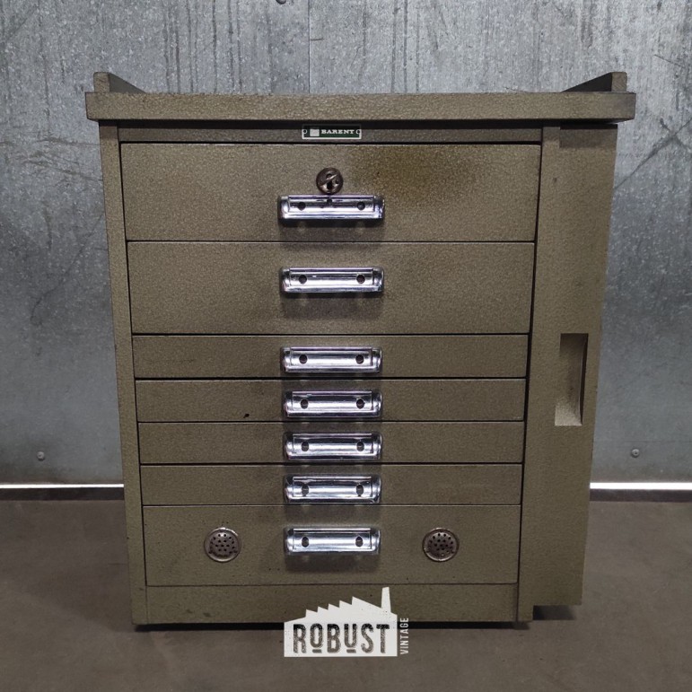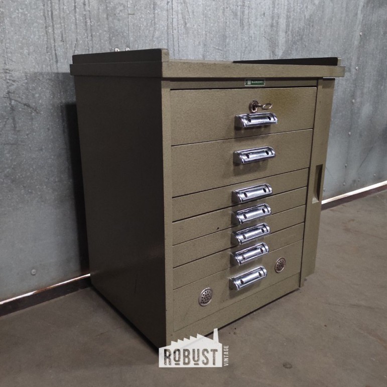 Drukkers ladekastje met 7 lades en verborgen opbergvak. Afm. 54x40x62,5 cm.