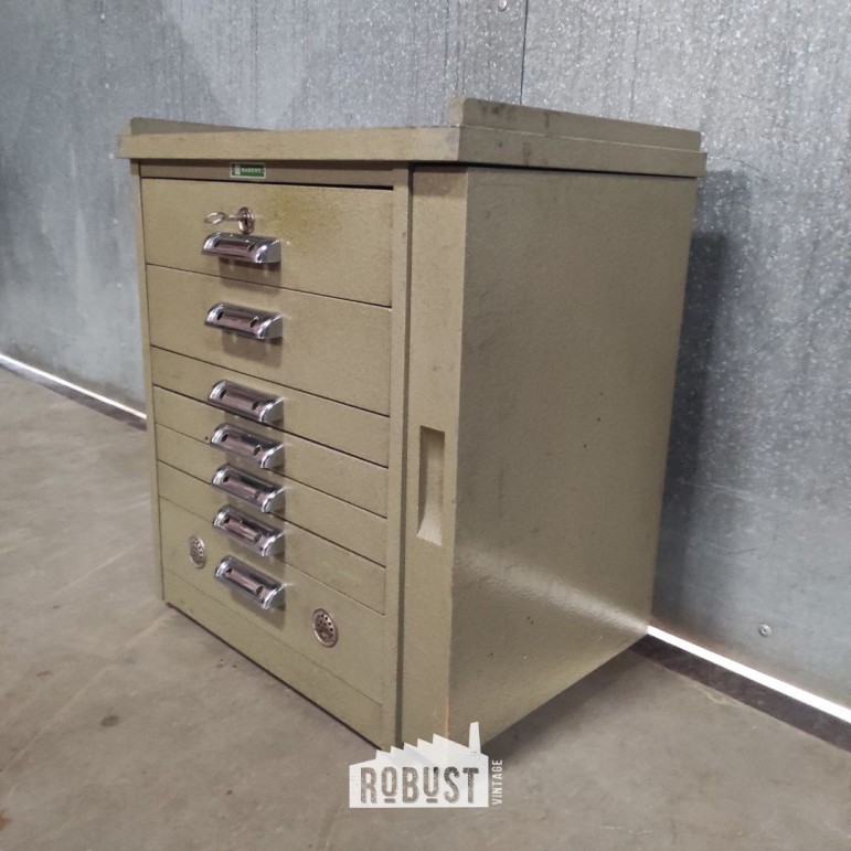 Drukkers ladekastje op wieltjes – vintage kast met 7 lades