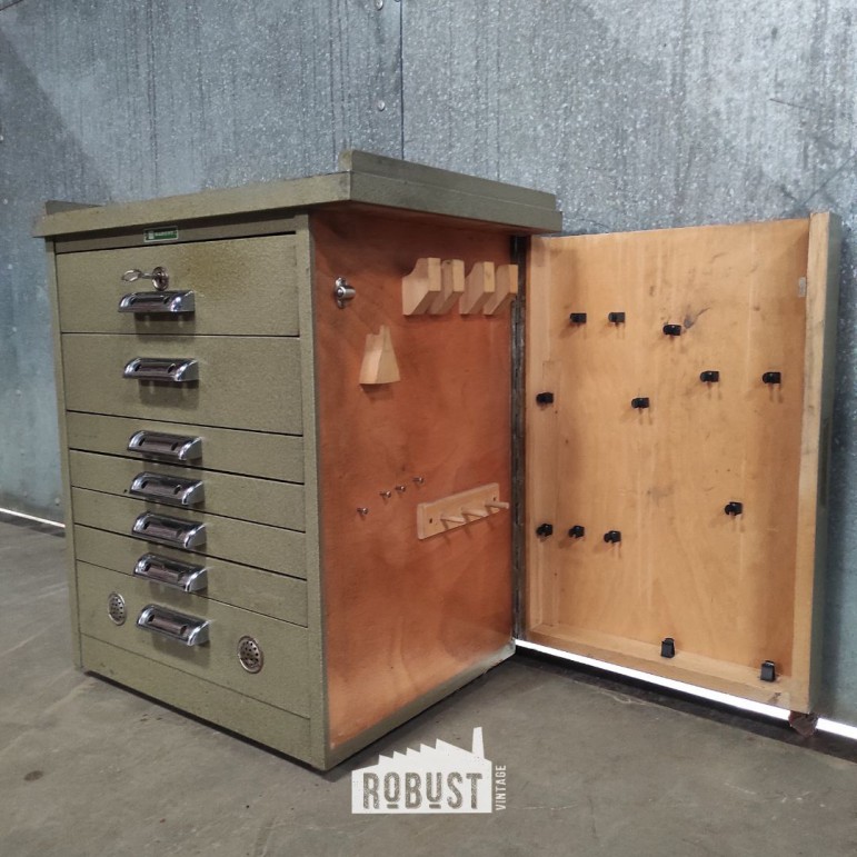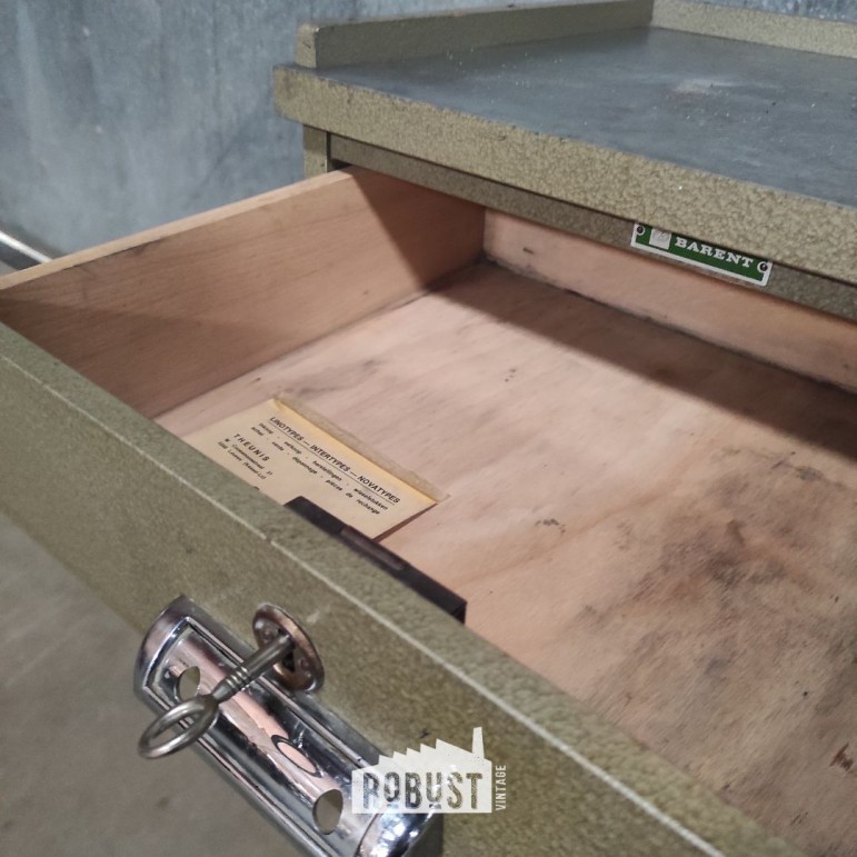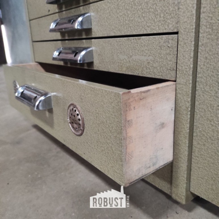 Soms vind je een meubel dat meer vertelt dan je op het eerste gezicht ziet. Dit drukkers ladekastje (54x40x62,5 cm) stond jarenlang in een drukkerij in de buurt. Oorspronkelijk bedoeld voor de bureau-benodigdheden van de graficus – we vonden er nog een lino-ets setje, drukzeef en verschillende inkten in terug.