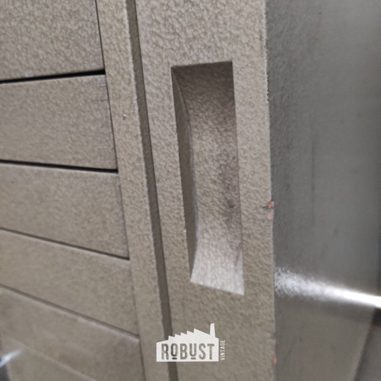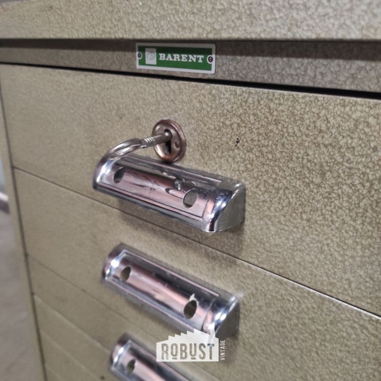 Het kastje heeft 7 praktische lades én een verborgen opbergruimte aan de zijkant, een slim detail dat je niet vaak ziet. Het is geverfd in een metaal-lookalike finish, waardoor het de stoere uitstraling van staal krijgt, terwijl het toch warm en compact oogt. Dankzij de kleine wieltjes schuif je het eenvoudig van plek naar plek – handig in een atelier, kantoor of woonkamer.