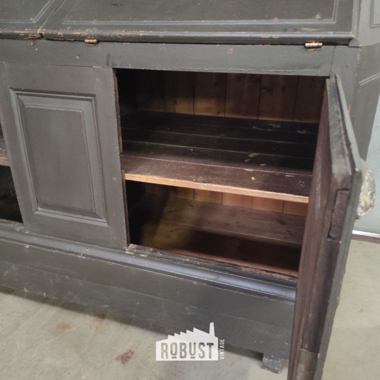 De kast heeft in de loop der tijd een kleine opknapbeurt gekregen, zodat ze weer klaar is voor dagelijks gebruik. Je vindt er twee grote deuren met royale opbergruimte, twee klepdeuren en twee afgeronde open leggers die perfect zijn om servies, boeken of decoratie uit te stallen. De elegante lijnen en de subtiele gouden accenten geven de kast een chique uitstraling, terwijl de grijze verflaag een rijk patina heeft.