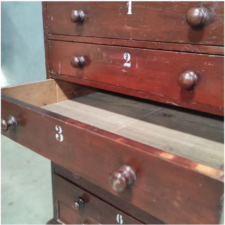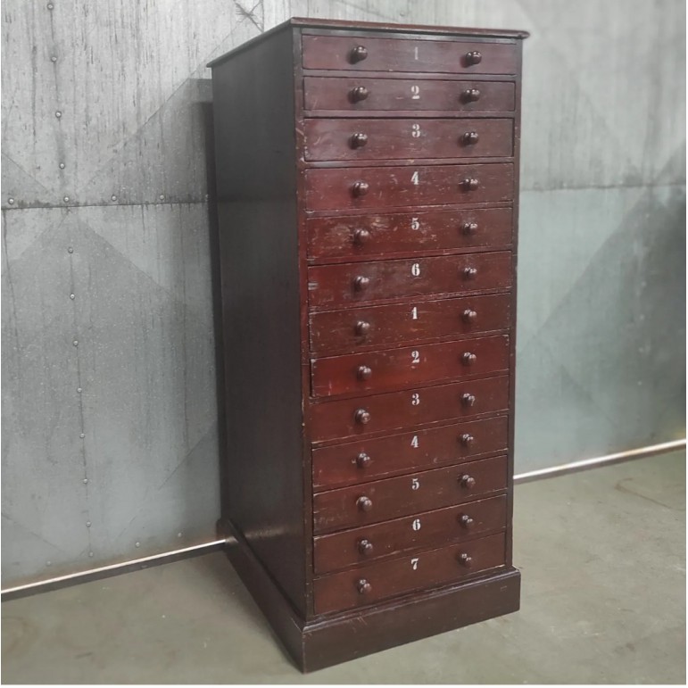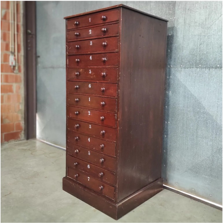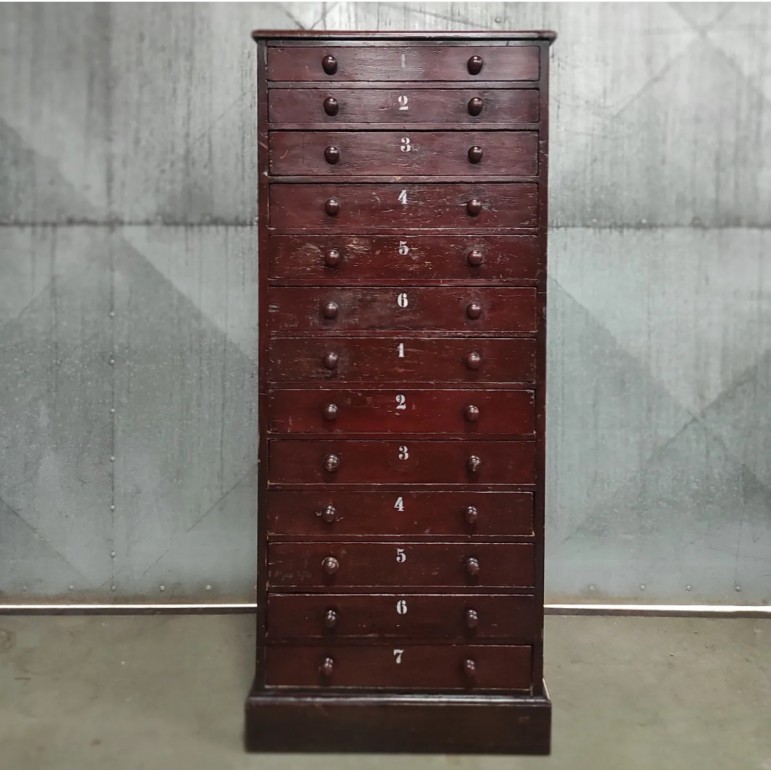 Vintage ladekast met nummering – houten opbergkast met donker patina