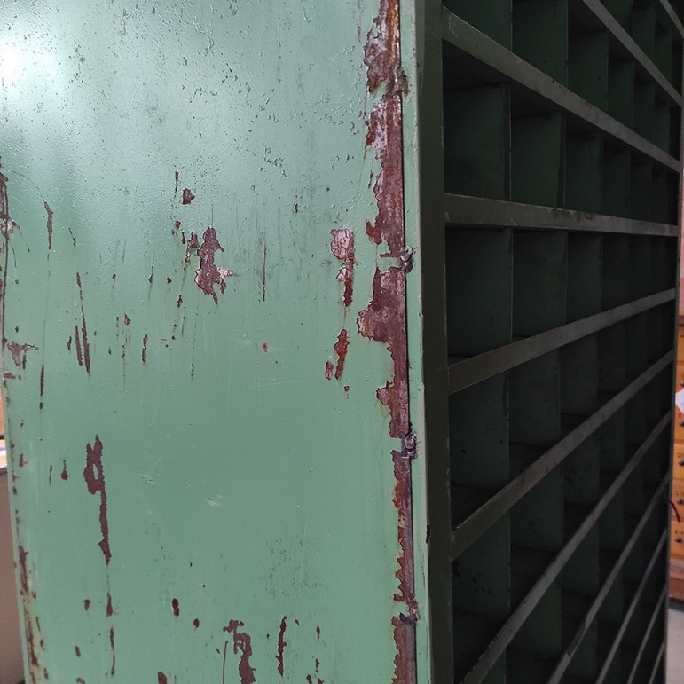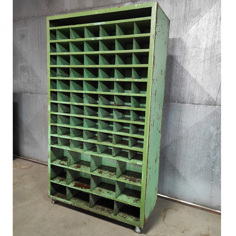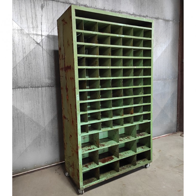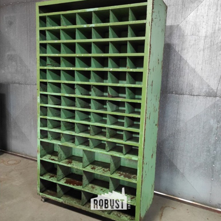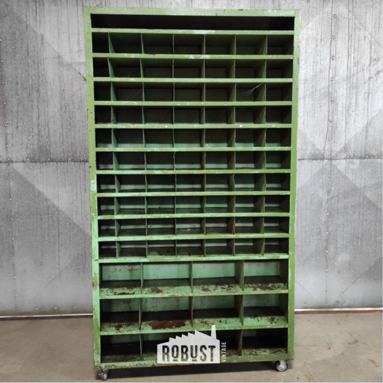 Een authentieke industriële kast die niet probeert te imponeren, maar het gewoon doet – met haar vorm, kleur en verleden.