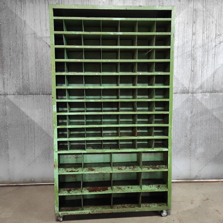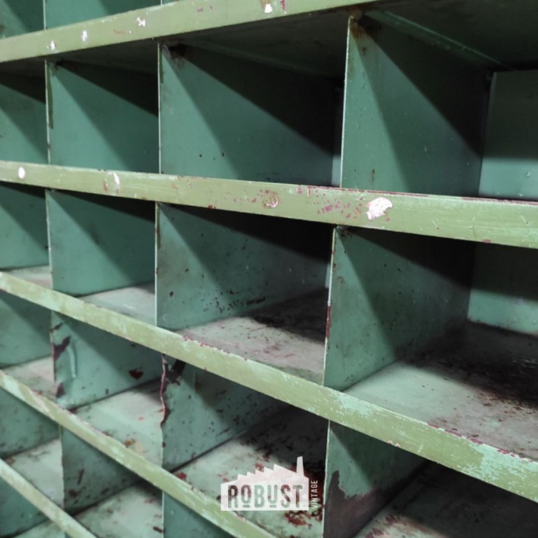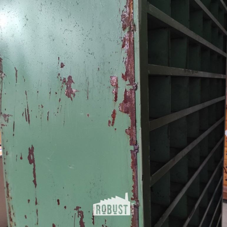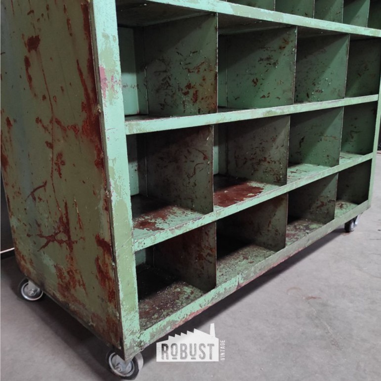 Groene metalen industriële kast – vakkenkast met patina, ideaal als roomdivider