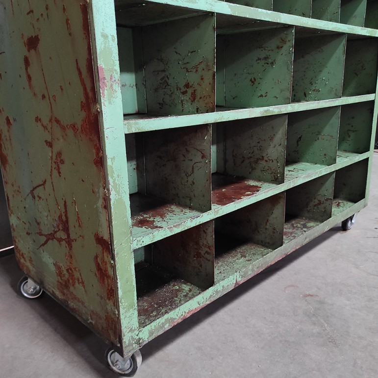 Origineel industrieel meubel – afkomstig uit een werkplaats of fabriek met zichtbaar verleden.