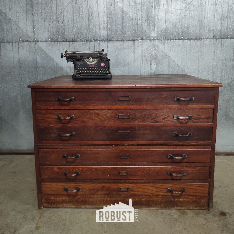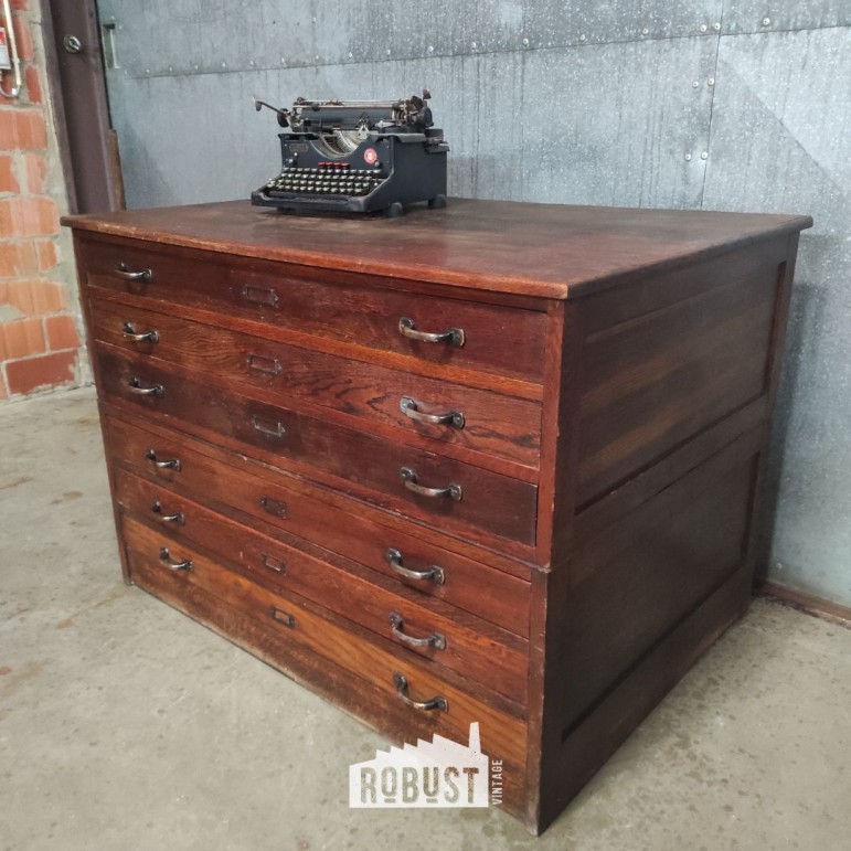 Vintage tekeningenkast / architectenkast 119x86x85 cm met 6 brede lades. Perfect voor grote tekeningen, plannen, kunstwerken en papieropslag.