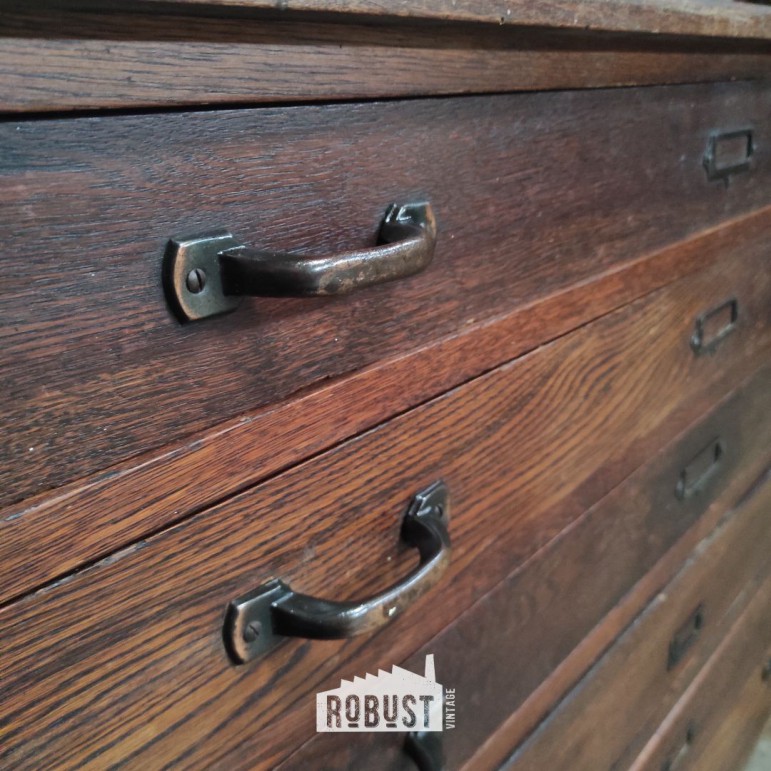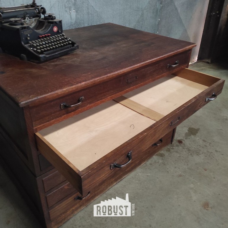Een mooie architectenkast die opnieuw klaarstaat om creatief werk, plannen en grafisch materiaal veilig en vlak te bewaren — precies waarvoor hij ooit gebouwd werd.