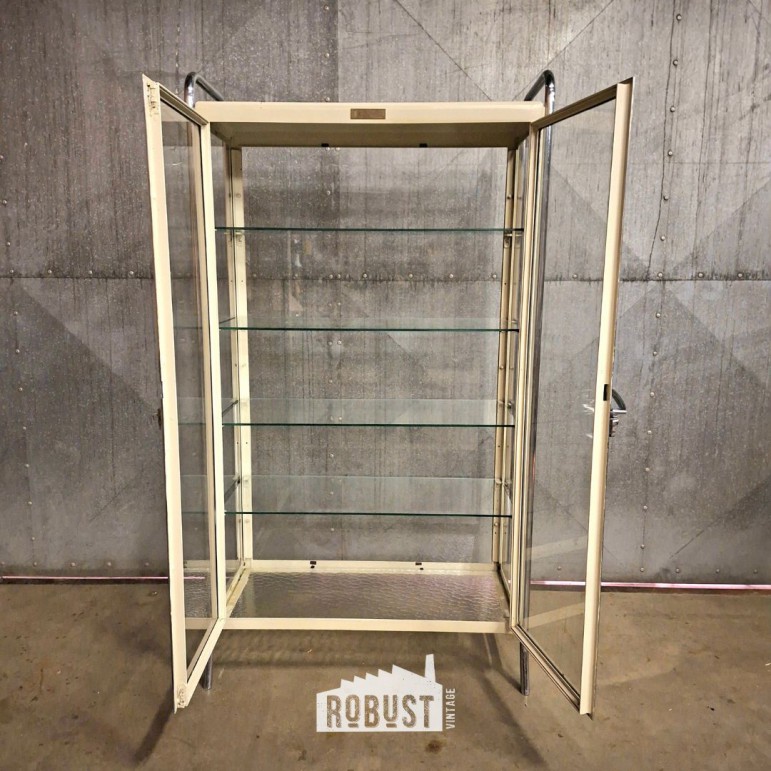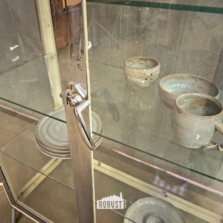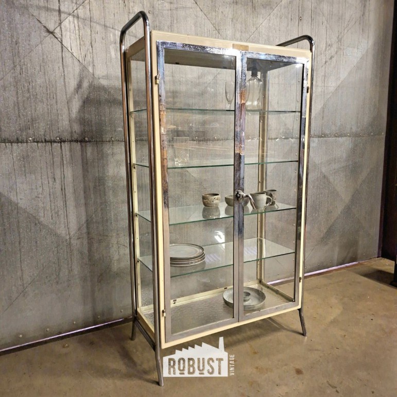 Een vintage vitrinekast / medische kast die licht oogt, maar toch veel kan dragen.