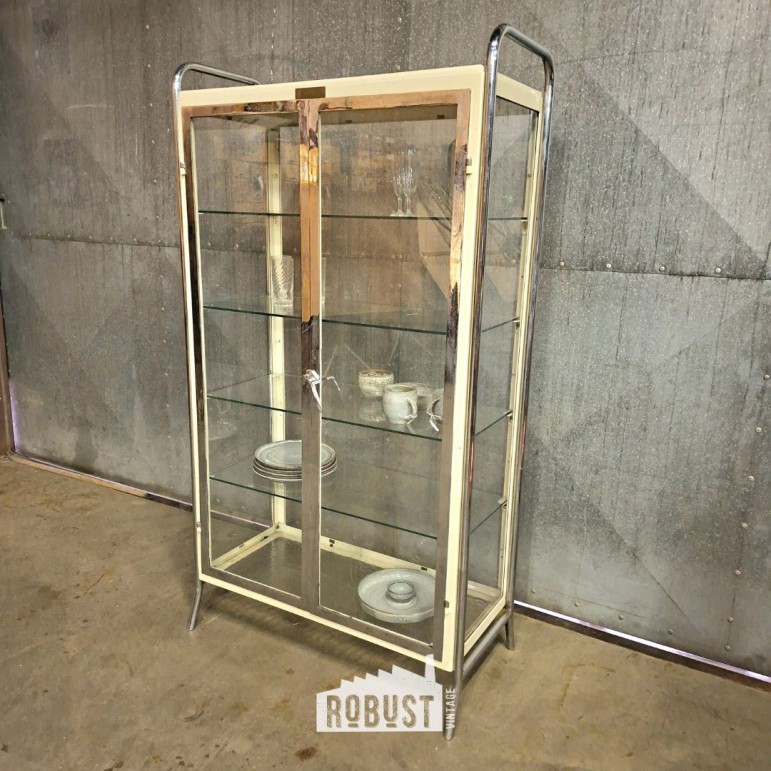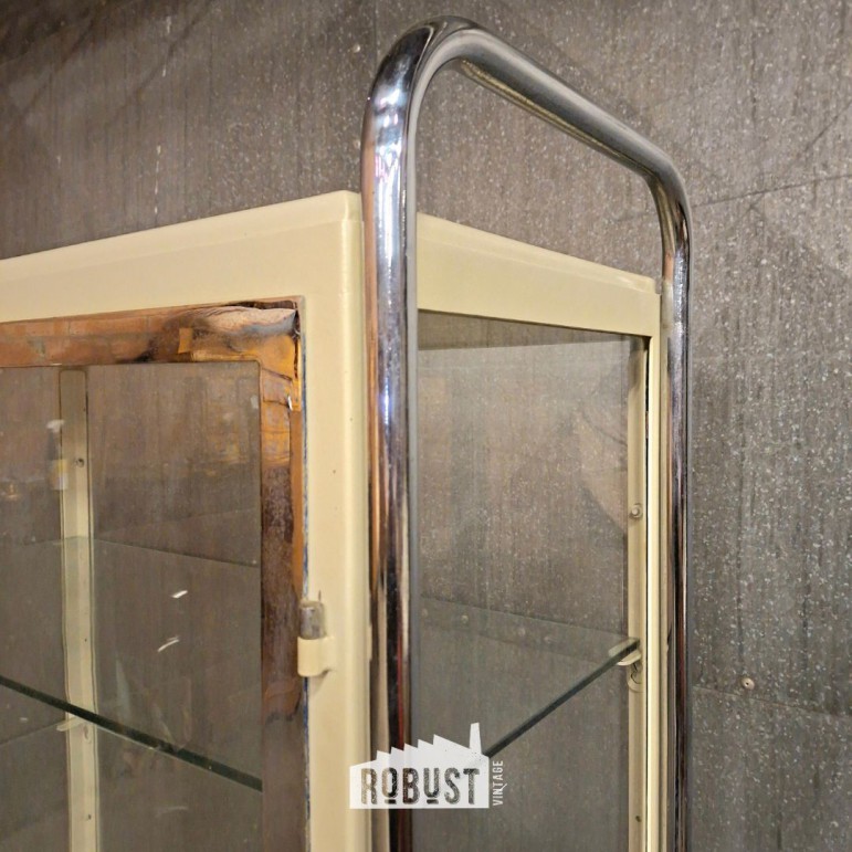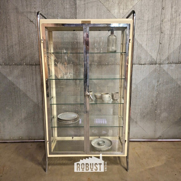 Vintage dubbele dokterskast / medicijnkast – glazen vitrinekast op chromen poten