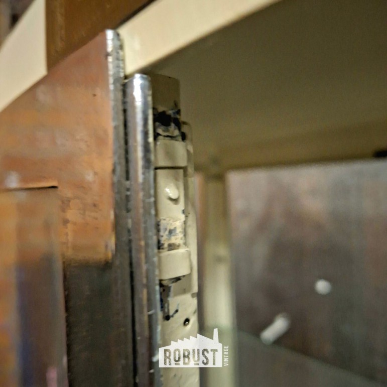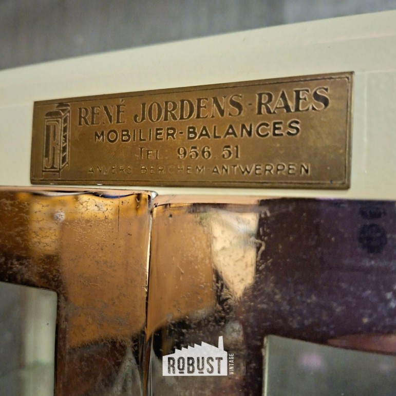 Binnenin vind je vier ruime leggers, ideaal voor glazen, flessen, servies, boeken of objecten die gezien mogen worden. Een bijzonder detail is het oorspronkelijke naamkaartje van de bouwer René Jordens-Raes, nog steeds aanwezig — een klein stukje geschiedenis dat het geheel extra geloofwaardig maakt.