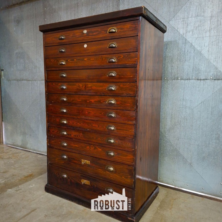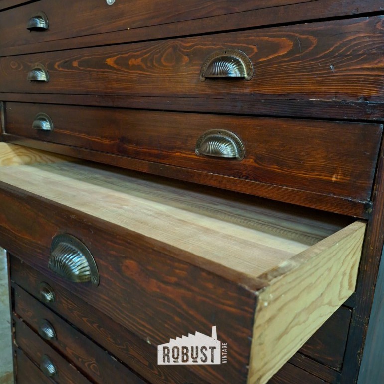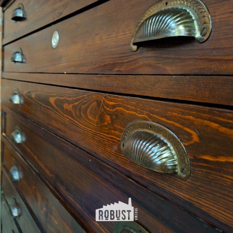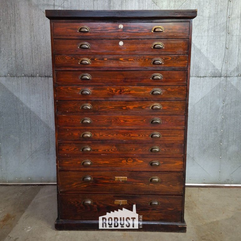 Hoge vintage ladekast met donker patina – elegante atelierkast met karakter