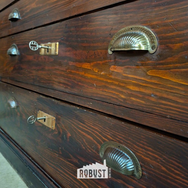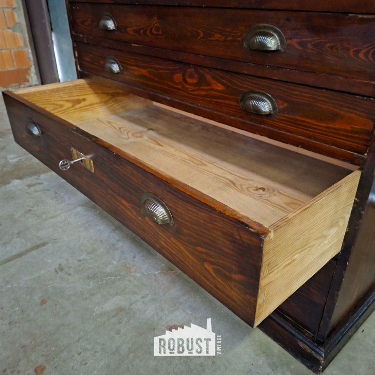 De indeling is doordacht. De kast telt meerdere lades in verschillende hoogtes, waardoor ze zich perfect leent als ladekast voor papierwerk, tekeningenkast voor kunst en prints, of atelierkast voor creatief materiaal. De bovenste twee en onderste twee lades zijn afsluitbaar, een detail dat vandaag nog steeds handig is voor documenten of persoonlijke spullen. De onderste lades zijn extra hoog, ideaal voor grotere objecten of stapels.