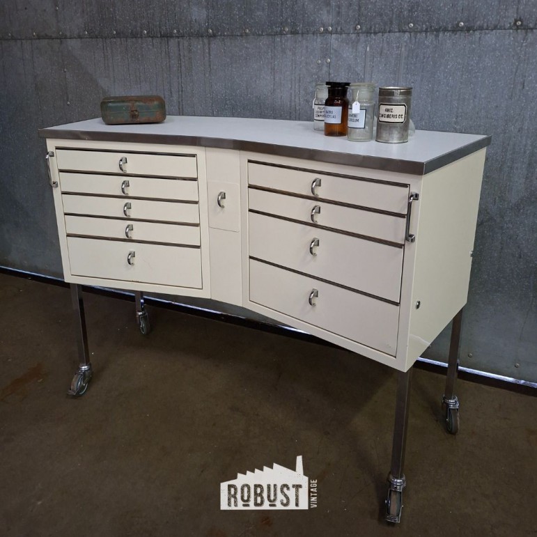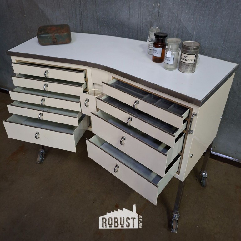 Voor liefhebbers van midcentury design, verzamelaars van medisch meubilair, maar ook voor wie extra lades wil kunnen bijtrekken wanneer nodig.