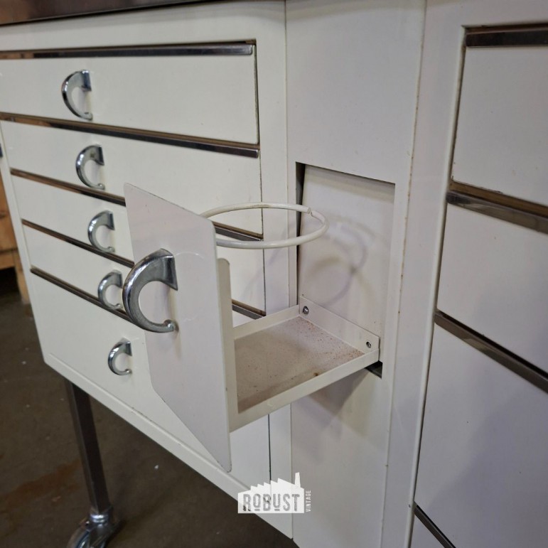 Vooraan beschikt het kastje over negen praktische lades, telkens voorzien van glas. Ideaal om materiaal overzichtelijk te bewaren. De geïntegreerde bekerhouder herinnert nog duidelijk aan zijn medische oorsprong. Wat dit exemplaar extra bijzonder maakt, is de licht schuinstaande vorm: daardoor bevindt zich aan de achterkant nog een extra opbergvak met glazen schap. Een verrassend detail dat je niet meteen verwacht.