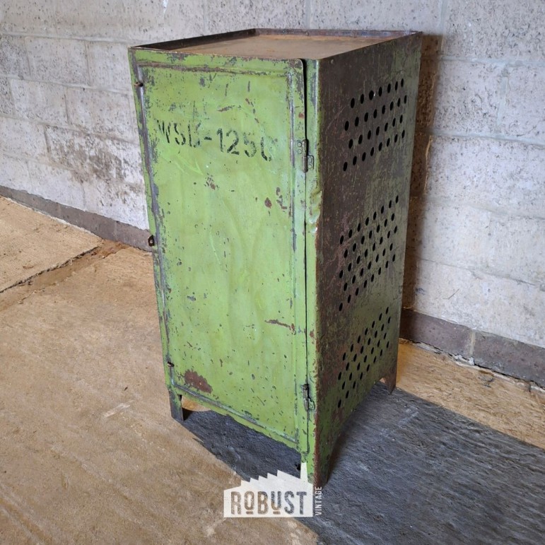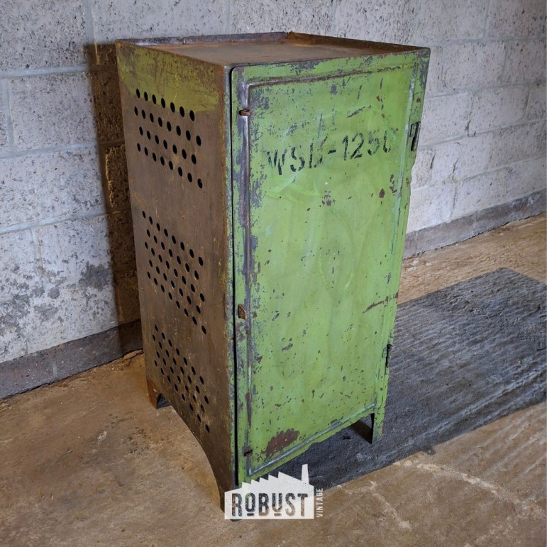 Dit is zo’n kast die je overal kan inzetten: als industrieel nachtkastje, metalen opbergkast in de hal, DDR locker in een atelier, schoenenkast bij de achterdeur, of als compact bijzetkastje in een winkel of horecazaak. Dankzij het vierkante formaat is ze makkelijk plaatsbaar, maar door haar kleur en patina zeker niet onzichtbaar.