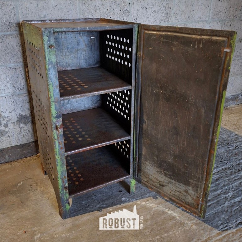 Aan de zijkanten zitten verluchtingsgaatjes, oorspronkelijk bedoeld voor ventilatie in een werkplaats. Vandaag maken ze dit kastje bijzonder geschikt als schoenenkast of sportkastje, waar frisse lucht welkom is. Binnenin vind je twee metalen leggers, stevig en praktisch voor allerlei toepassingen.
