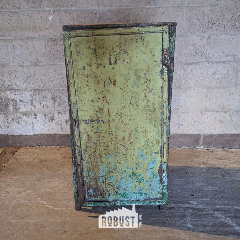 De deur staat door jarenlang gebruik een klein beetje scheef. Dat zie je. Maar het doet niets af aan de werking of stevigheid. Integendeel, het benadrukt dat dit een authentieke industriële opbergkast is die echt gewerkt heeft.