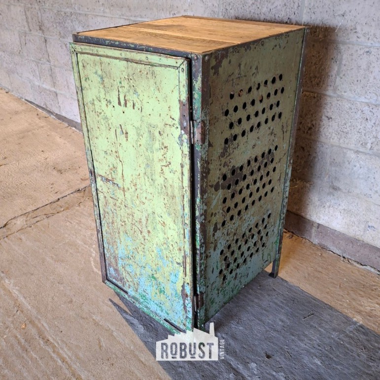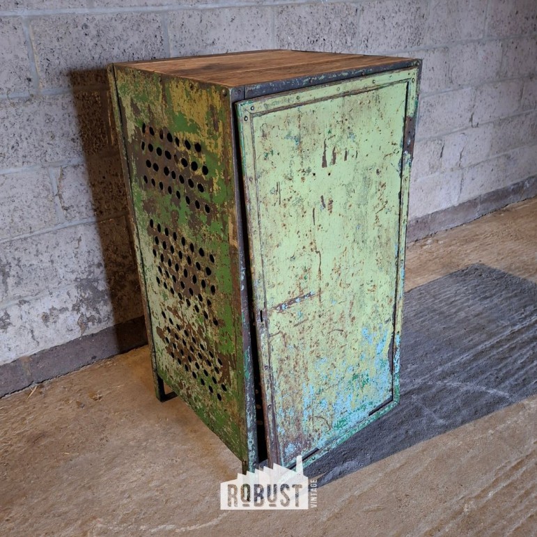 Het metaal kreeg door de jaren heen een mooi zachtgroen patina. Geen vlakke verflaag, maar een doorleefde tint met nuance. In combinatie met het houten bovenblad ontstaat een warm contrast dat dit kastje net iets toegankelijker maakt dan de klassieke volledig metalen lockers.