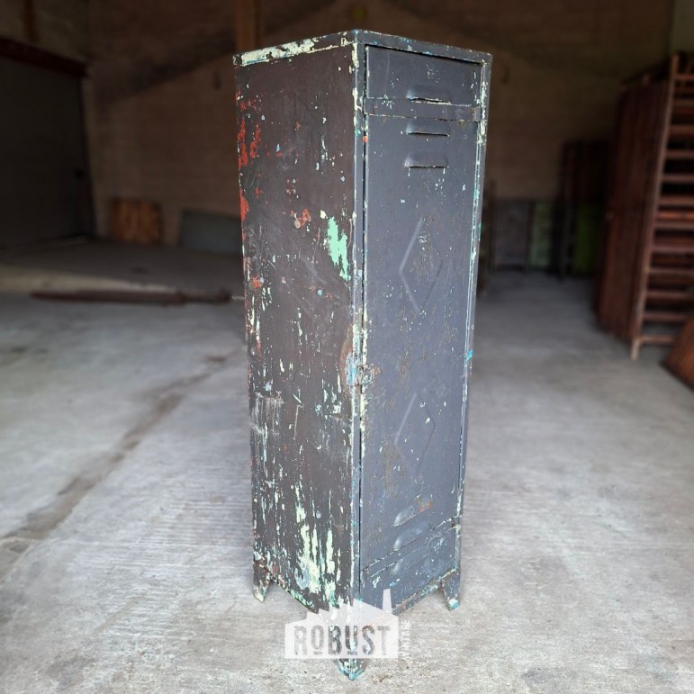 Deze Franse 1-deurs locker heeft een uitstraling die je niet kan faken. Donkergrijs met een rijk, gelaagd patina van verschillende verflagen door de jaren heen. Geen egale kleur, maar een geschiedenis in lagen.