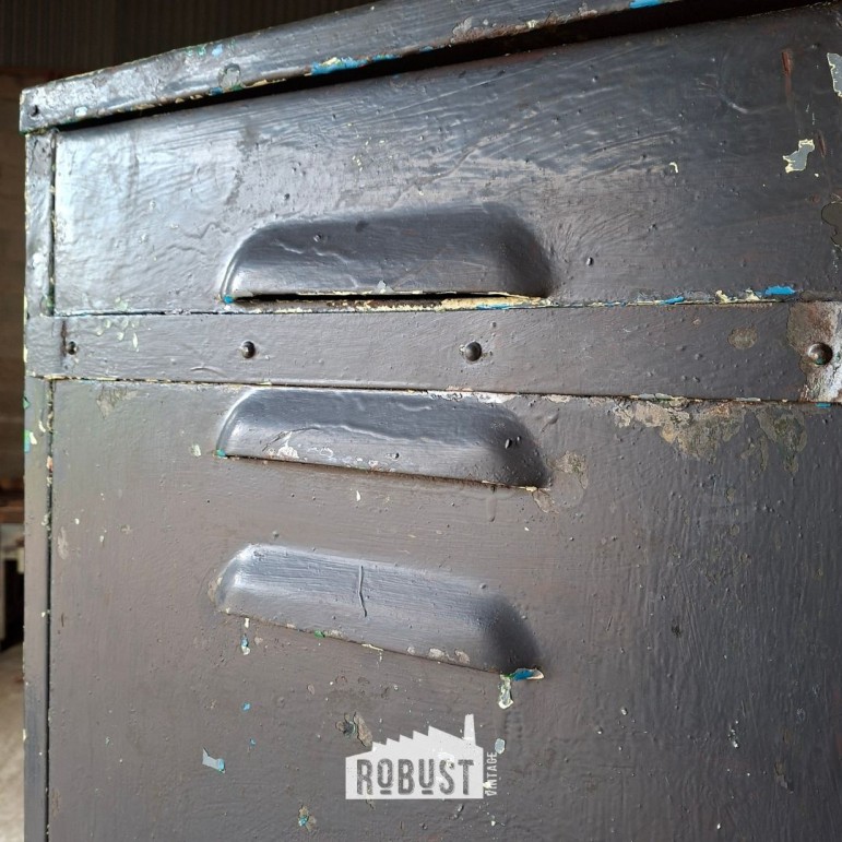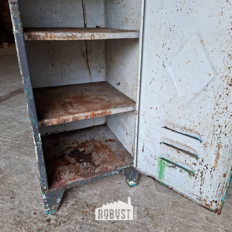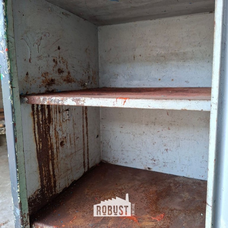 We vermoeden dat deze metalen fabriekskast ooit in een verflokaal heeft gestaan. Kleine details en verfsporen binnenin verraden dat hier jarenlang potten en blikken opgeborgen werden. Zo kreeg ze haar unieke kleurgeschiedenis. Geen kunstmatig patina, maar eentje dat gegroeid is.