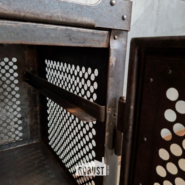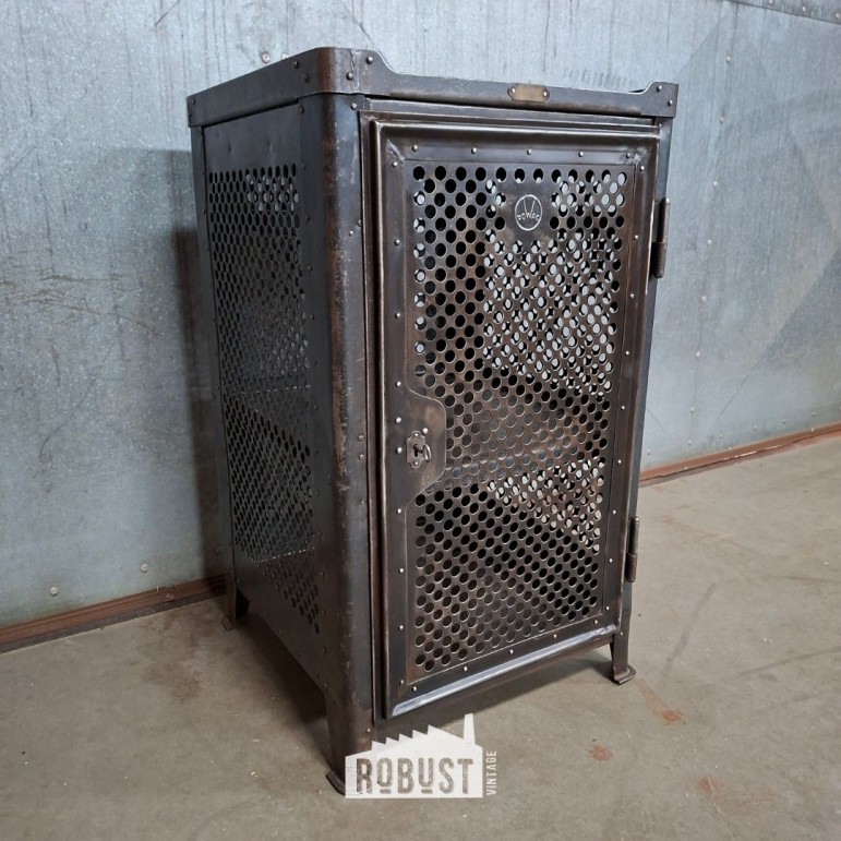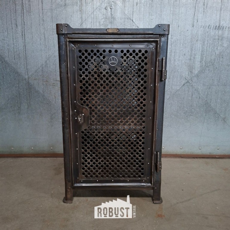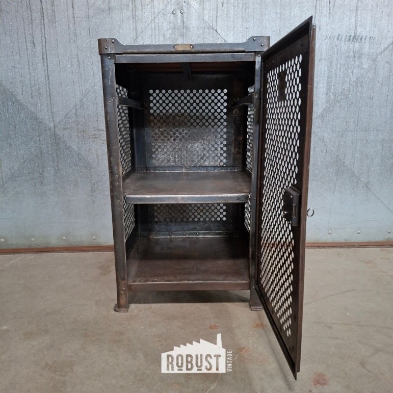 Industrieel metalen werkkastje met donker patina en bloemvormige perforatie in de deur. Met leggers, lade en draaiklink. Compacte fabriekskast met karakter. 50x50x100cm