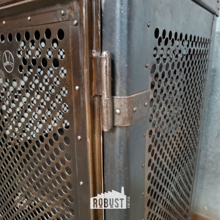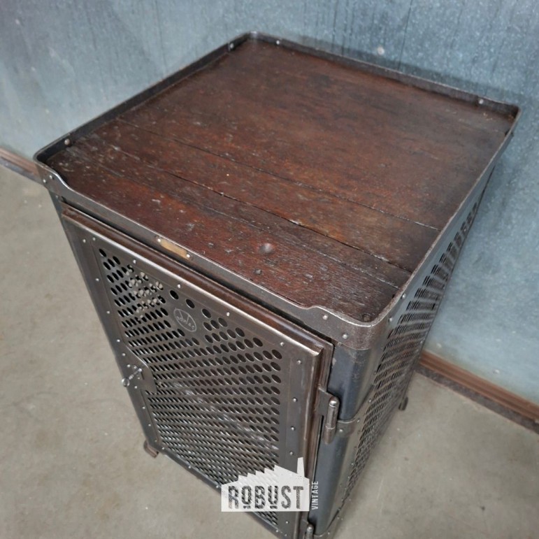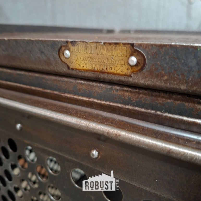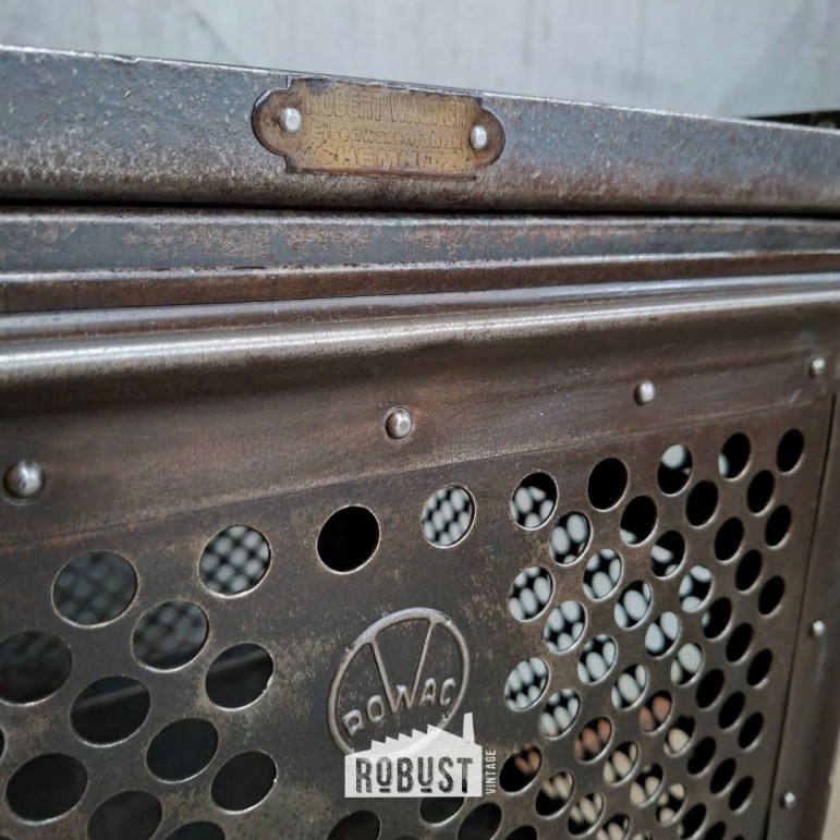 Dit kastje draagt nog steeds trots de originele ROWAC- en Robert Wagner markeringen. Het metaal werd volledig opgeschuurd tot blank staal, waardoor de constructie en de pure industriële vorm nog sterker naar voren komen.