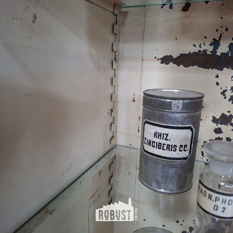 Dit is geen strak gerestaureerd stuk, maar een authentieke dokterskast met een uitgesproken industriële look. Precies dat soort patina dat veel liefhebbers zoeken: eerlijk, doorleefd en vol karakter.