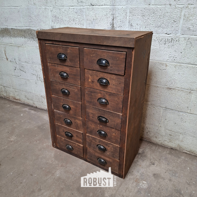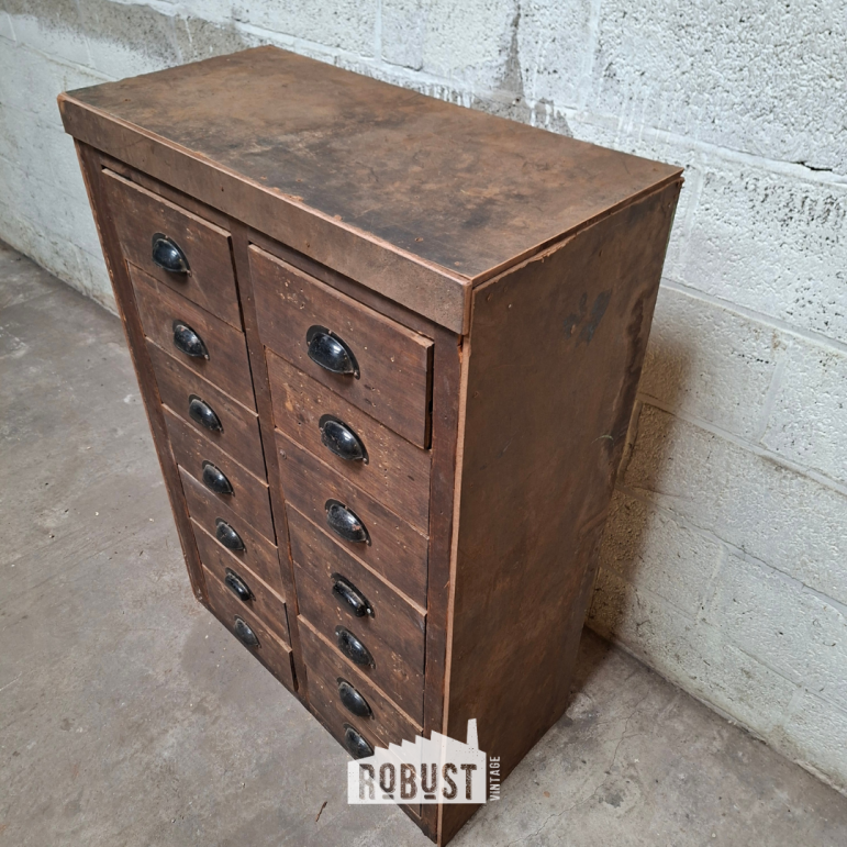 Kleine apothekersladekast van donker hout met zwarte komgrepen en 12 lades. Ideaal voor knutselspullen, verzamelobjecten of als praktisch en stijlvol opbergkastje. 75 x 36 x 106 cm
