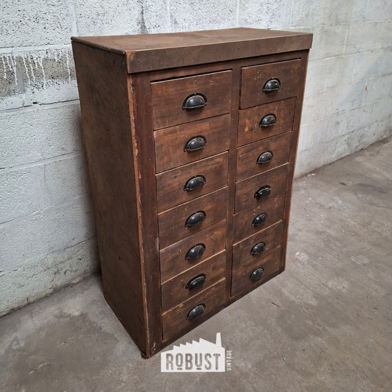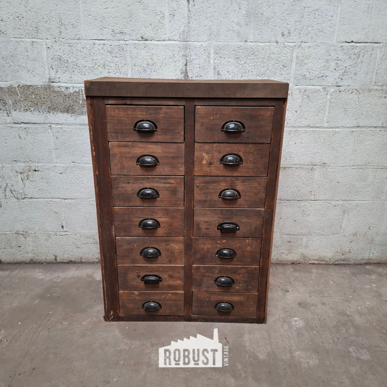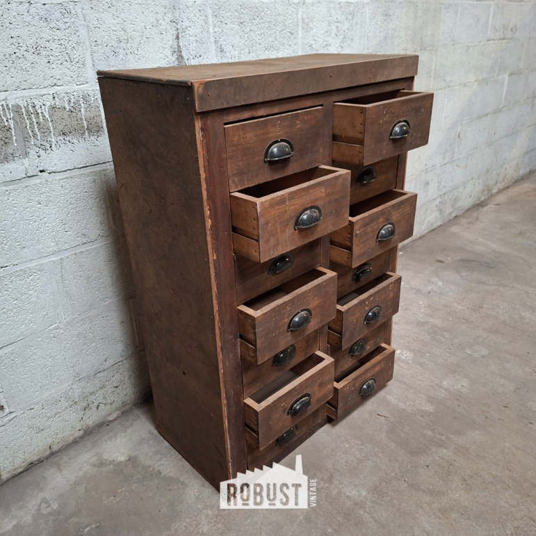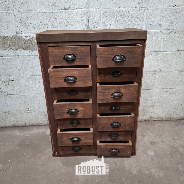 Een charmant apothekersladekastje dat met zijn compacte formaat en diepe lades direct uitnodigt tot organiseren. Het donkerbruine hout straalt warmte en karakter uit, terwijl de zwarte komgrepen een subtiel stoer accent toevoegen. Perfect om kleine spullen overzichtelijk op te bergen, van knutselmaterialen tot verzamelobjecten.