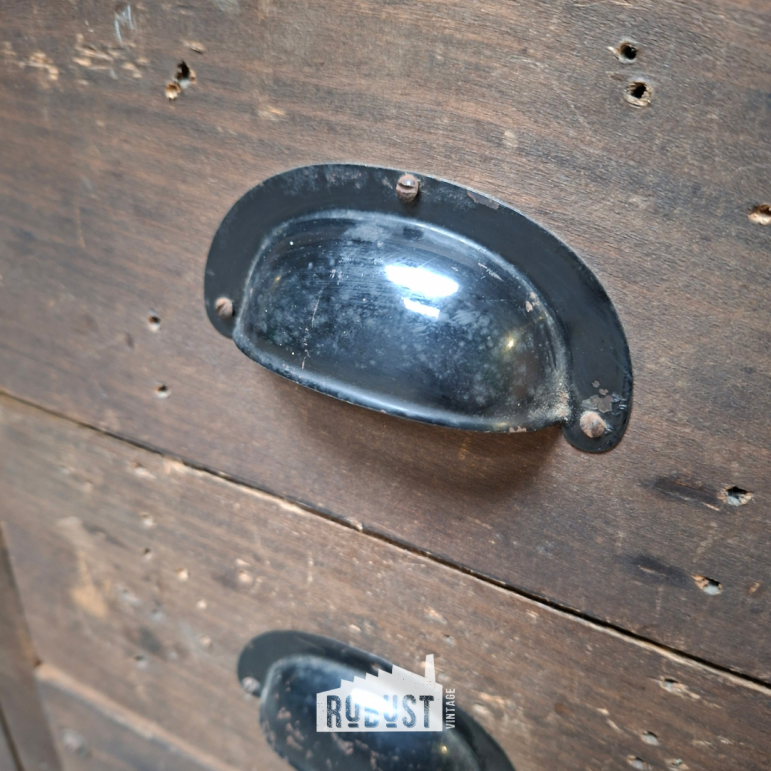 De praktische lades lopen soepel en bieden verrassend veel opbergruimte, waardoor dit kastje zich moeiteloos aanpast aan verschillende functies. Of je het nu gebruikt in een atelier, woonkamer of winkel, het combineert functionaliteit met een authentieke uitstraling.