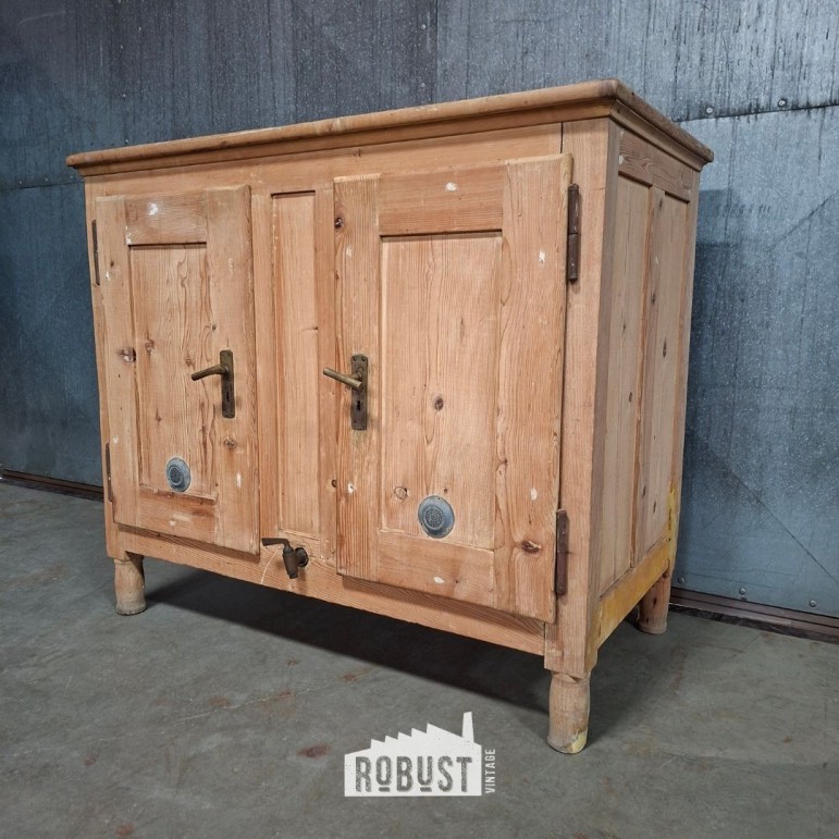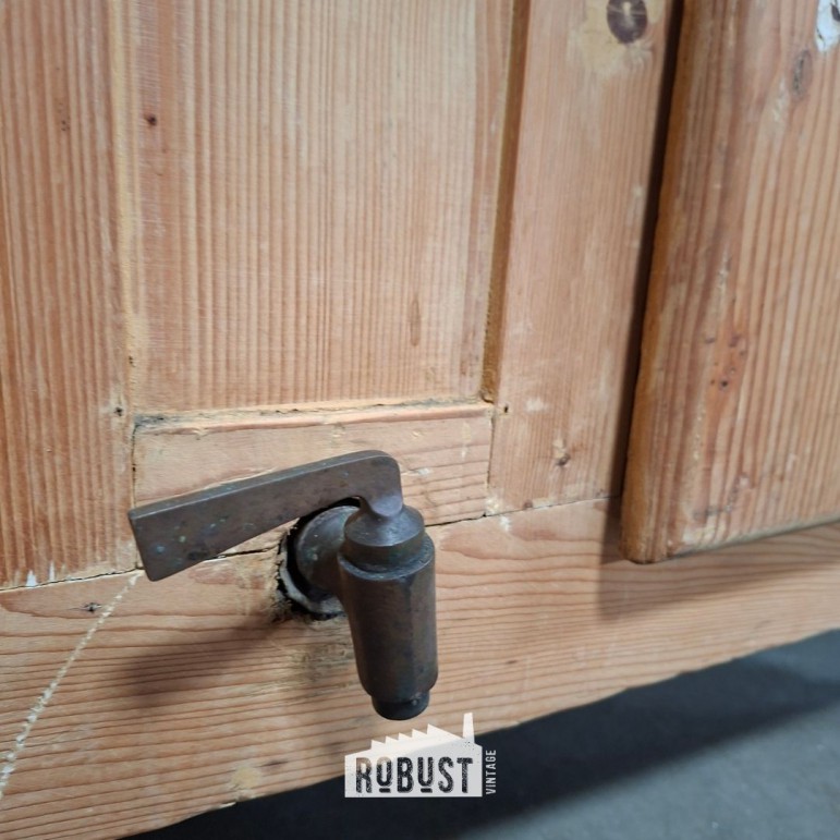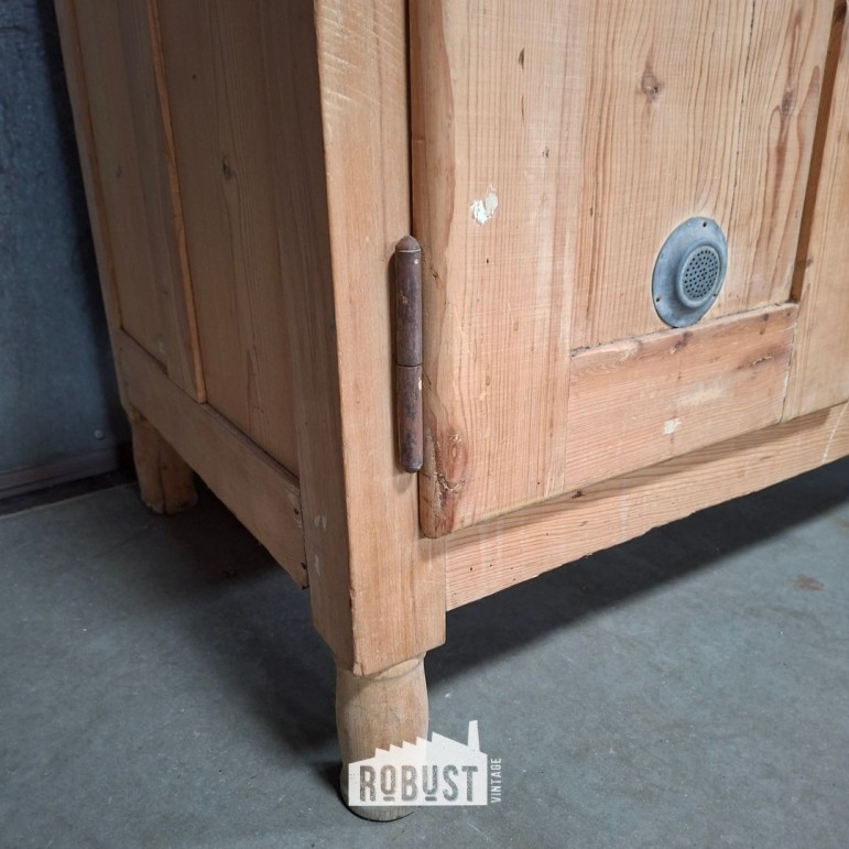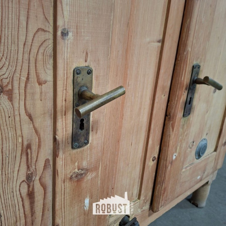 Gemaakt uit pitch pine, een houtsoort die bekendstaat om zijn sterkte en warme uitstraling. De nerven en het doorleefde oppervlak geven deze kast een rijke, geleefde look zonder dat het zwaar aanvoelt. De proporties zijn compact, maar het meubel heeft toch voldoende aanwezigheid om op te vallen.