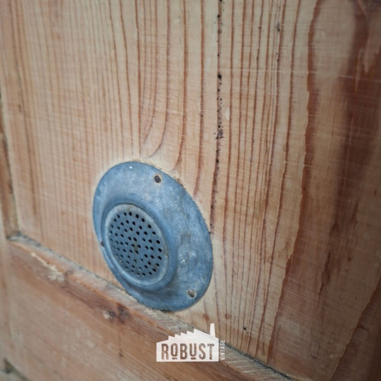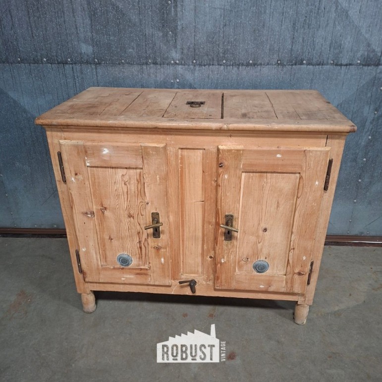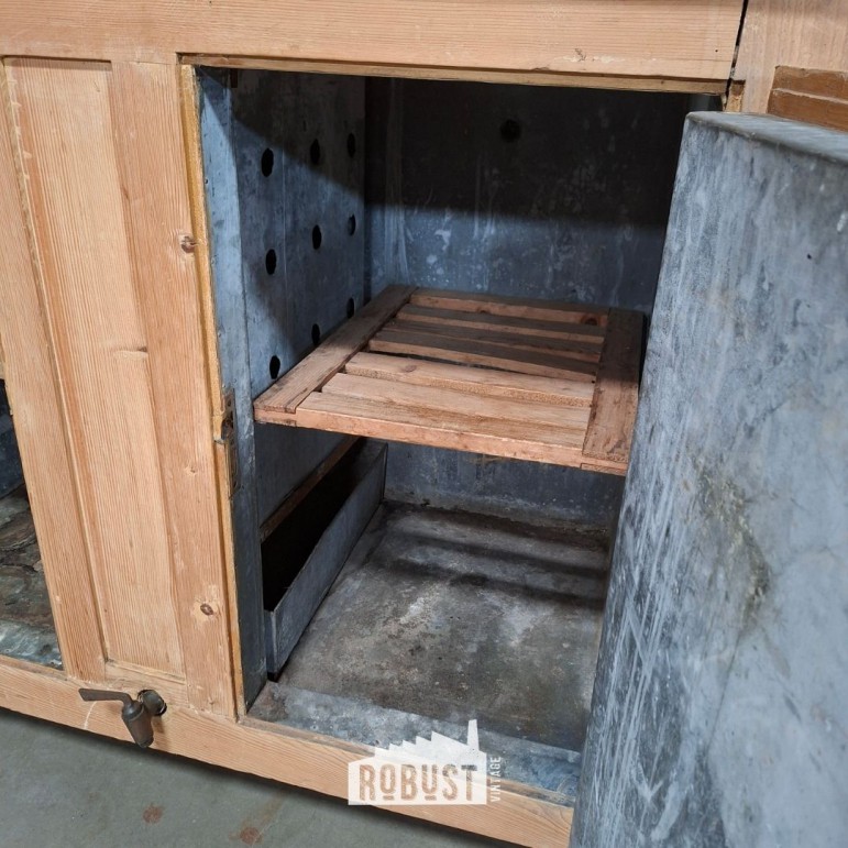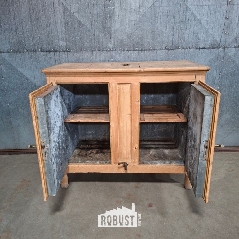 Een karaktervolle houten ijskast die meteen de sfeer oproept van vroeger. Dit type ice cabinet werd gebruikt lang vóór de elektrische koelkast zijn intrede deed, met bovenaan een compartiment voor ijs dat de inhoud koel hield. Een mooi voorbeeld van hoe praktisch denken en degelijk vakwerk samenkomen.