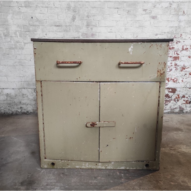 Stoer werkkastje met een zachte kleur. Metalen kastje met een grote lade en 2 deurtjes vooraan. Net wat je nodig hebt om heel wat spullen on weg te bergen.