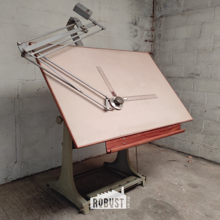 We vonden deze tafel bij de familie van een overleden architect, die hem jarenlang met liefde gebruikte en verzorgde. De hoogte en hoek zijn verstelbaar, dus of je nu wilt schetsen, ontwerpen of presenteren: dit vintage werkpaard staat voor je klaar.