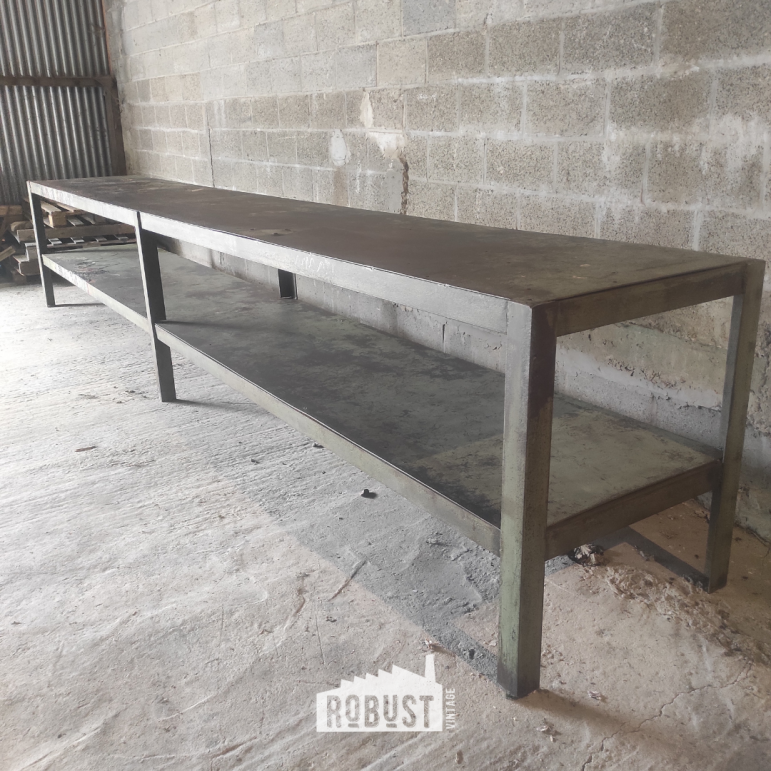 Vijf meter. Vijf meter werkblad. Dat zie je niet elke dag. Deze industriële stalen werkbank is er eentje van het indrukwekkende soort. Twee niveaus, een stevige constructie en een verleden dat je nog kunt zien. Letterlijk.