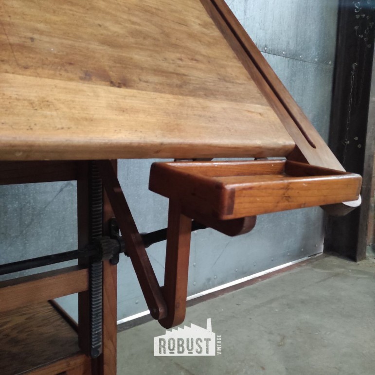 De tafel heeft een prachtige houten voet met daarin een grote lade waarin je al je materiaal kwijt kunt: potloden, pennen, papier, kleine tools… alles binnen handbereik, maar netjes opgeborgen. Het verstelmechanisme is echt vakmanschap: met een slim draaisysteem regel je zowel de hoogte als de hoek van het blad. En het beste detail? Het potloodbakje blijft altijd perfect horizontaal, ongeacht hoe schuin je het blad zet. Een kleine maar briljante uitvinding die meteen verraadt dat deze tafel door een vakman ontworpen werd.