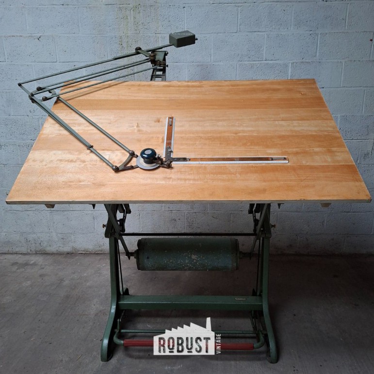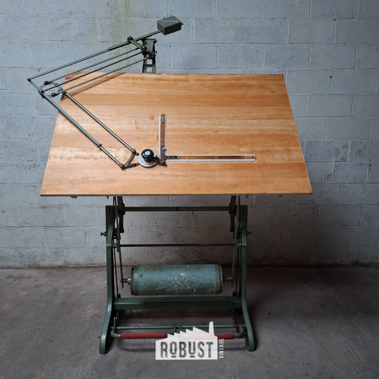Een vintage architecten tekentafel / klassieke tekenplank die gebouwd werd om op te werken — en dat vandaag nog altijd moeiteloos doet.