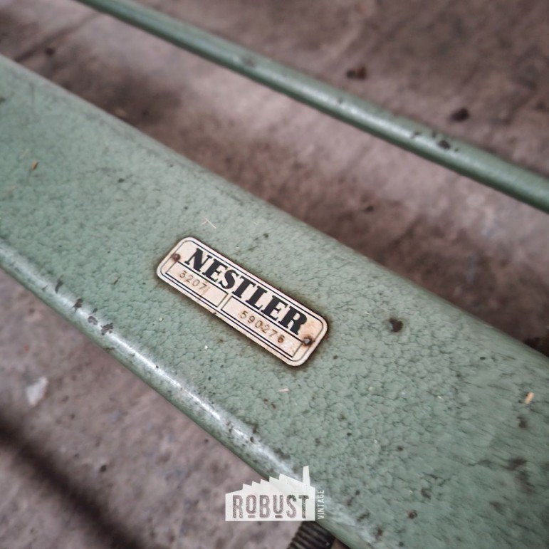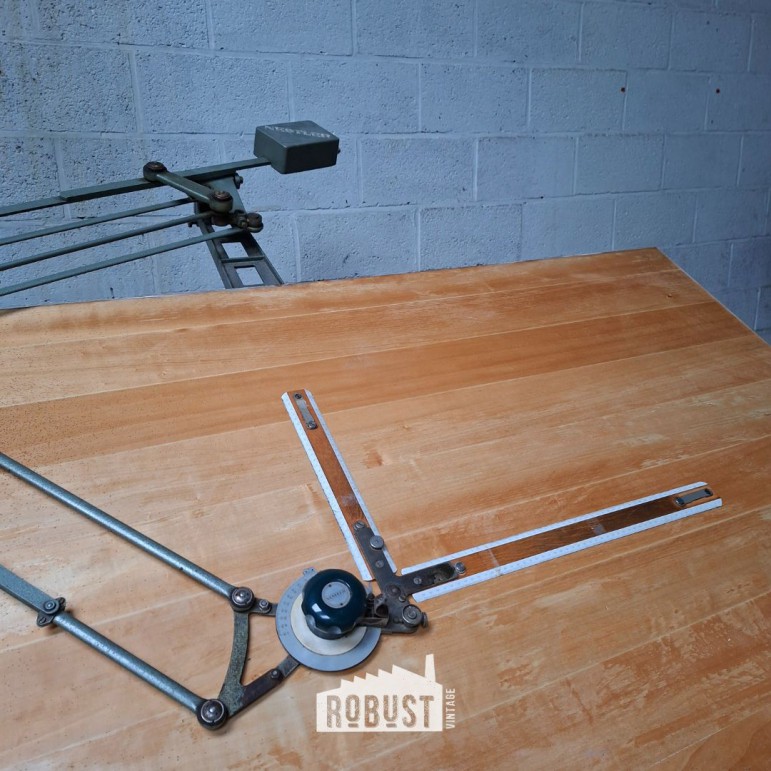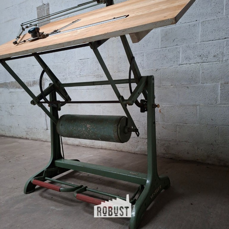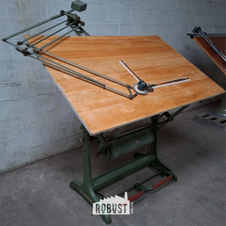 Extra mooi aan dit exemplaar: de originele Nestler tekenarm met houten tekenlatten is nog aanwezig. Een essentieel onderdeel voor nauwkeurig tekenwerk, en een grote meerwaarde voor wie de tafel ook effectief wil gebruiken. Deze architecten tekentafel / tekenplank / ontwerptafel voelt zich vandaag perfect thuis in een atelier, studio, kantoor, maar evengoed als statementstuk in een interieur met liefde voor functioneel design.
