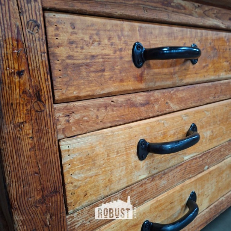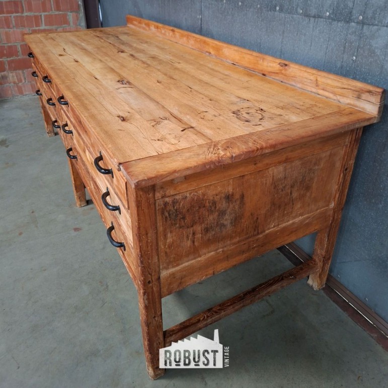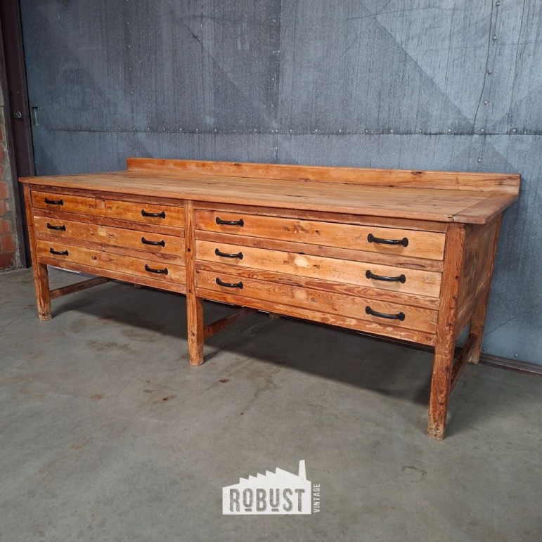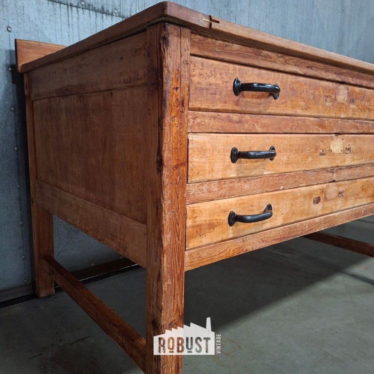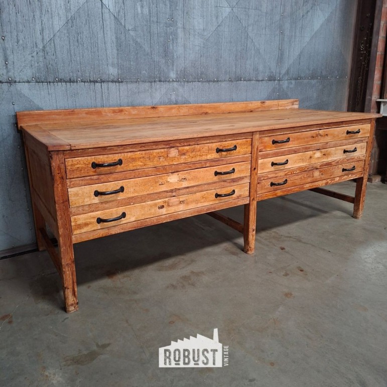 De tafel beschikt over zes brede lades, wat haar niet alleen praktisch maakt als werktafel, maar ook verrassend veelzijdig. De lades zijn ruim genoeg voor keukengerief, linnen, papierwerk of zelfs tekeningen, waardoor dit meubel ook perfect kan functioneren als tekeningenkast, dressoir of opbergmeubel.