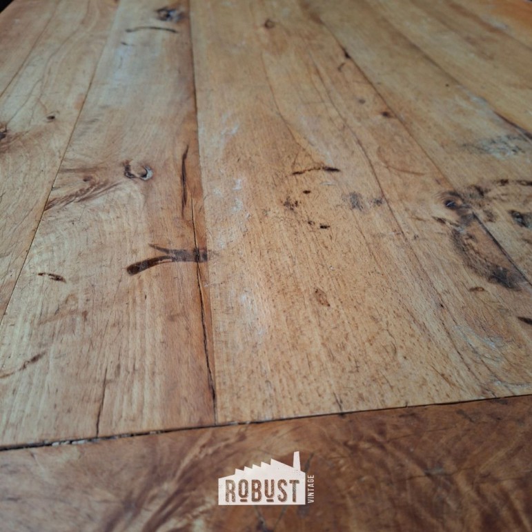 Het hout heeft een mooi, doorleefd patina dat enkel ontstaat door jarenlang gebruik. Geen perfect glad oppervlak, maar een tafel met karakter en geschiedenis.