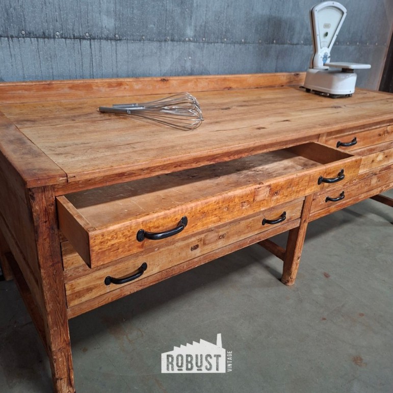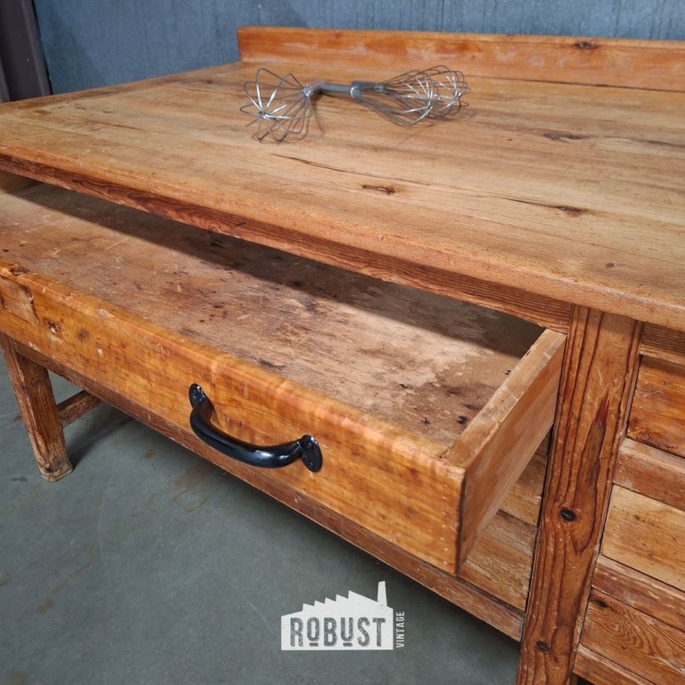 Grote bakkerstafel met lades – massief beuken werktafel / keukeneiland met patina