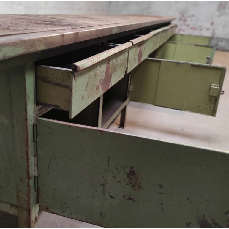 Geweldige metalen monster werkbank in prachtig industrieel groen. XXL uitvoering voor extra werkruimte. Mooi als groot keukeneiland, toonbank, werkplek in je huis, shop of atelier!
