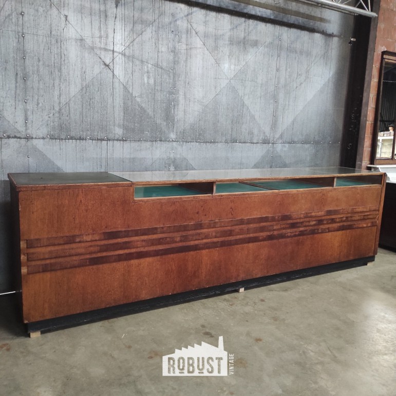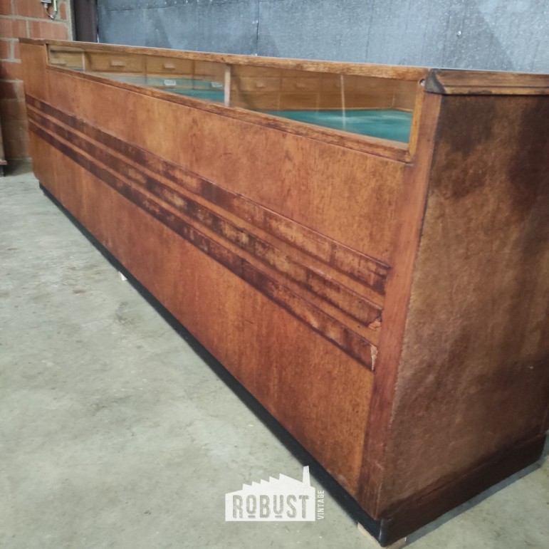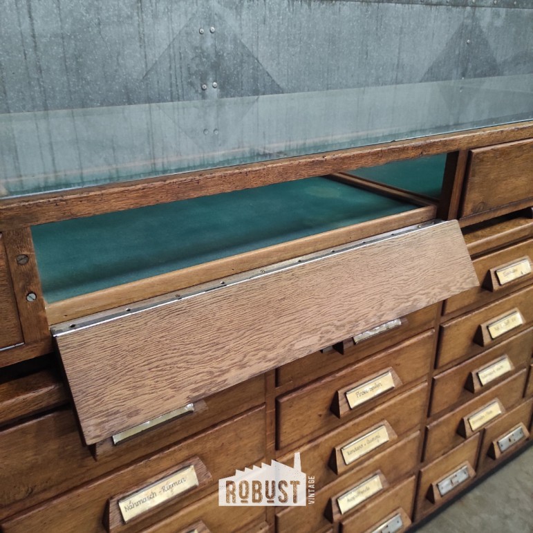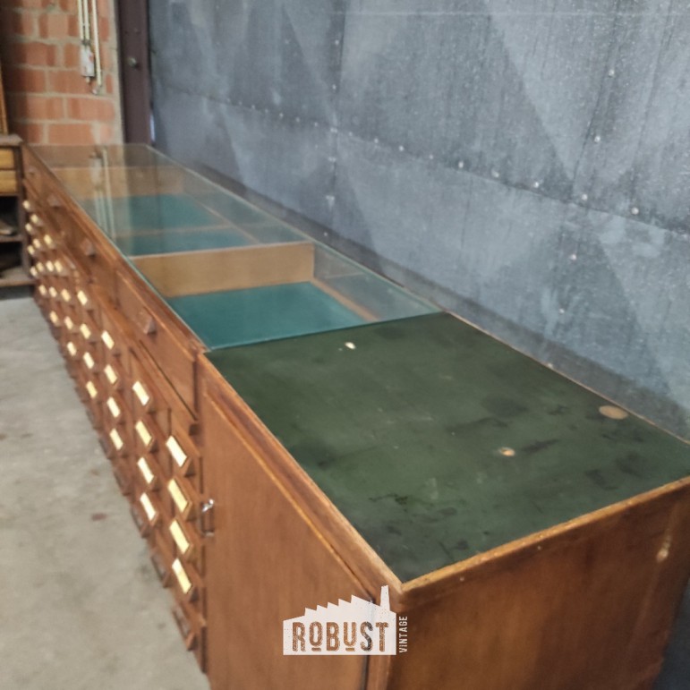 Grote apothekerstoonbank – vintage toonbank met lades, vitrine en werkbladen