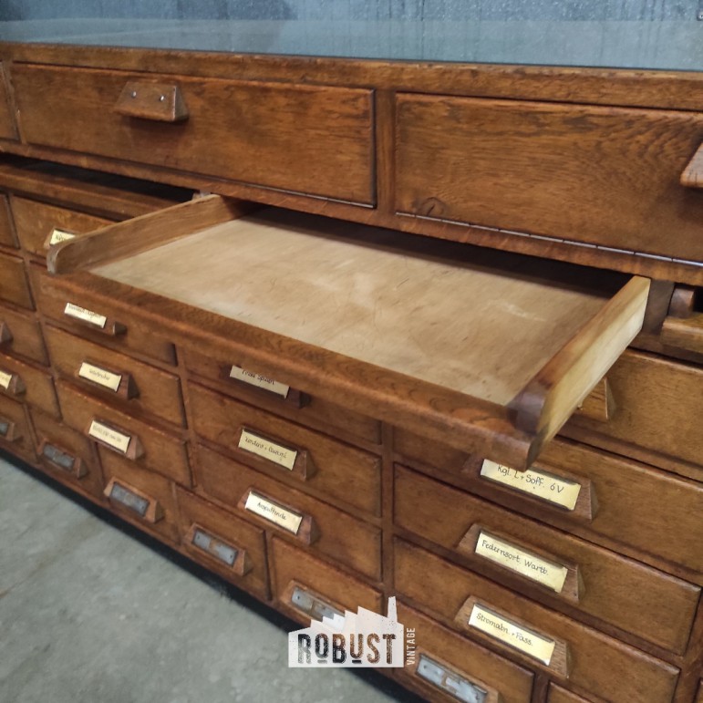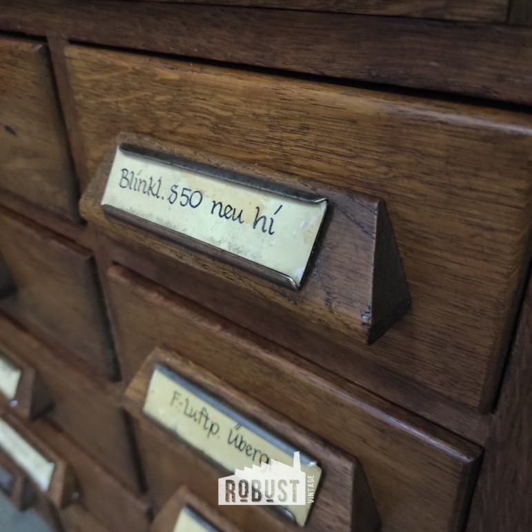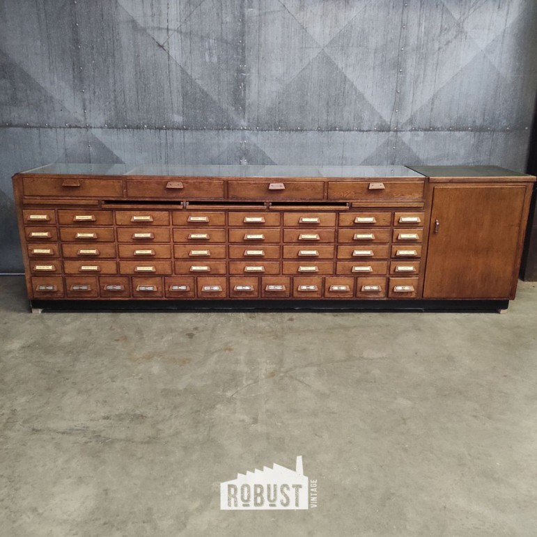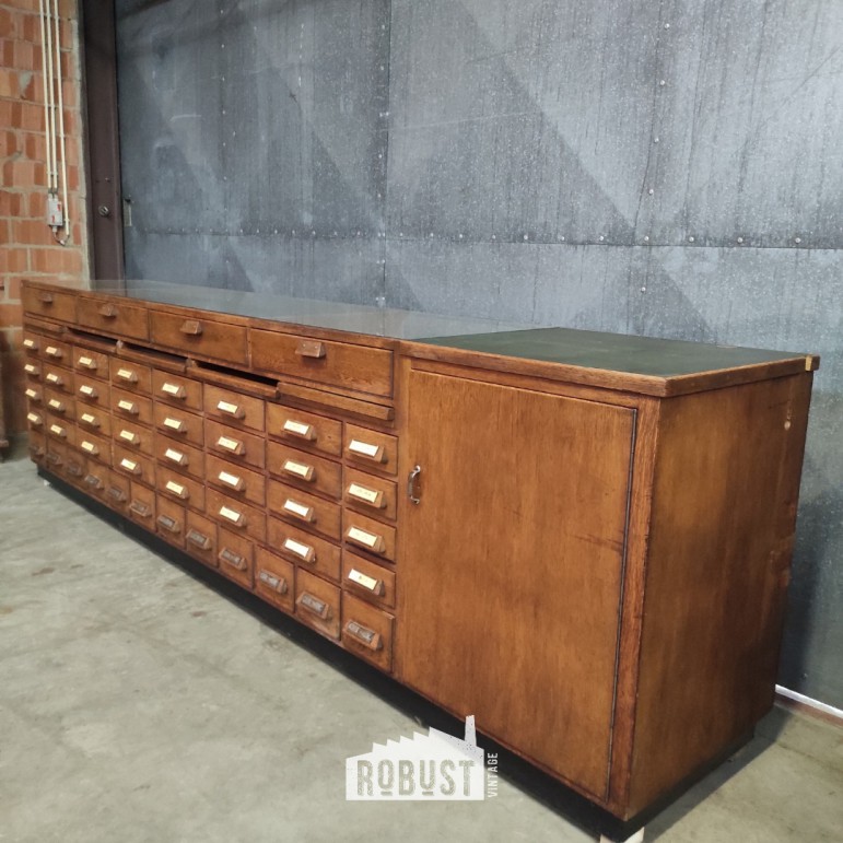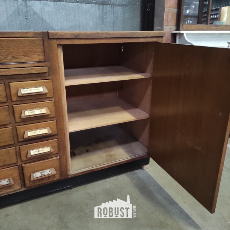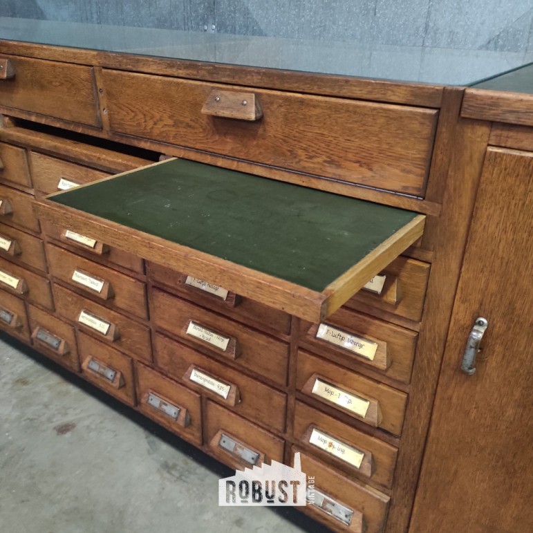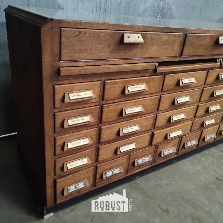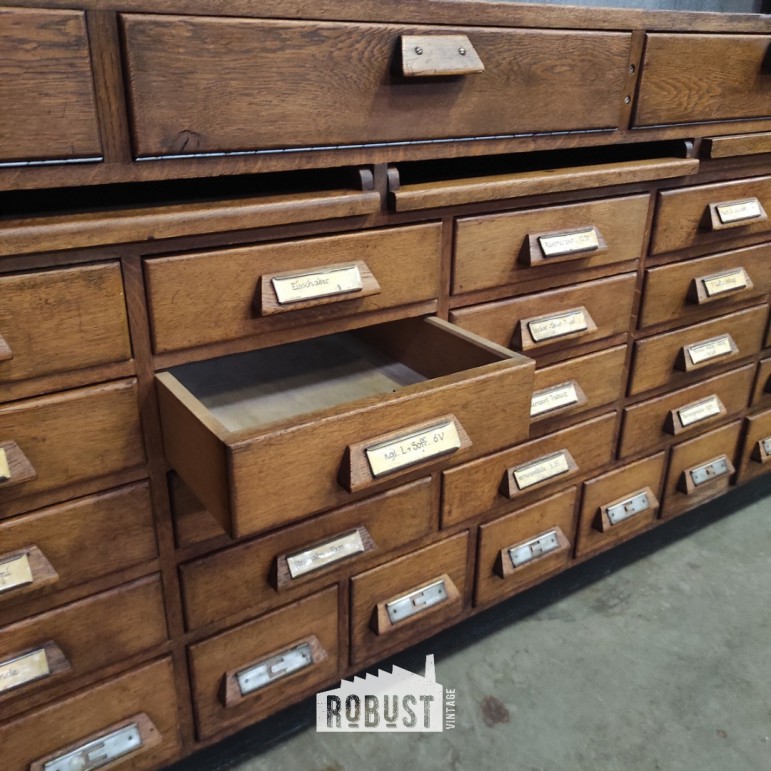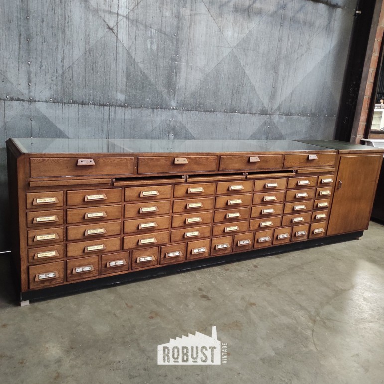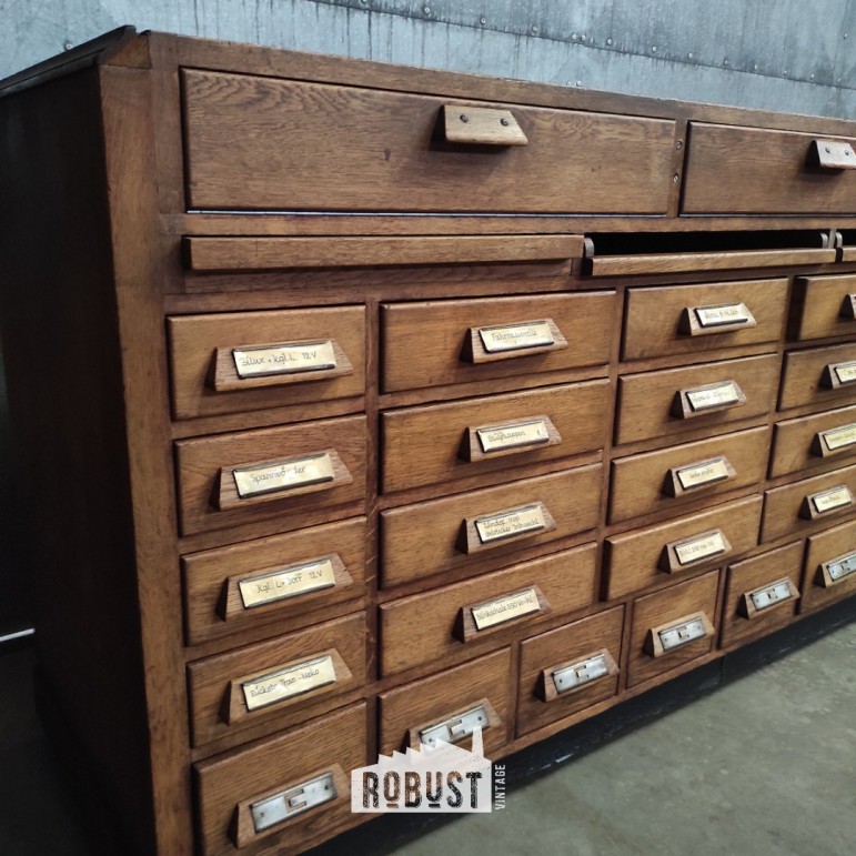 Authentieke details – de typische lades met etikethouders herinneren aan zijn oorspronkelijke functie en geven hem zijn unieke uitstraling.
